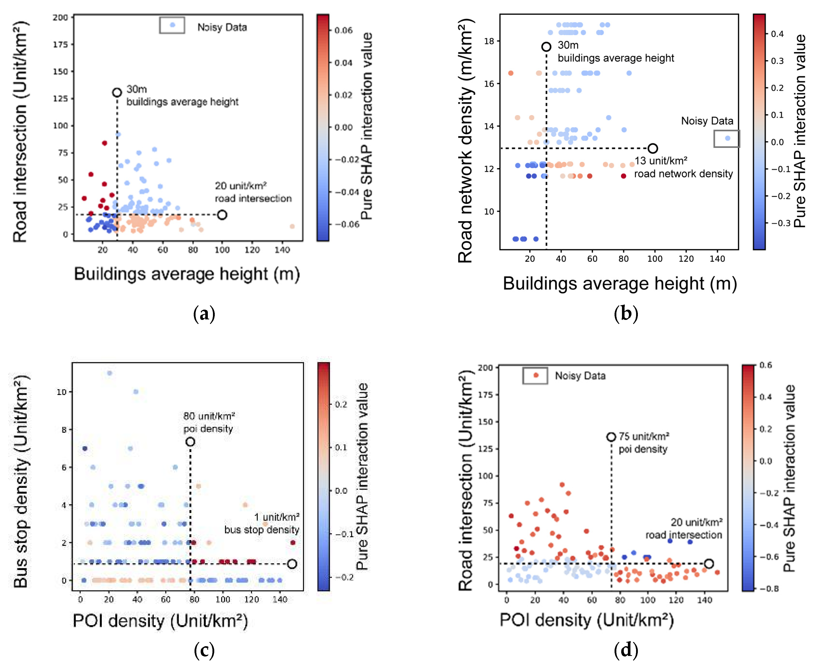 Figure 14), which reveal complex interdependencies among variables. For example, POI density and bus stop density (used as a proxy for transit density) demonstrate strong synergistic effects when both exceed thresholds—80 units/km