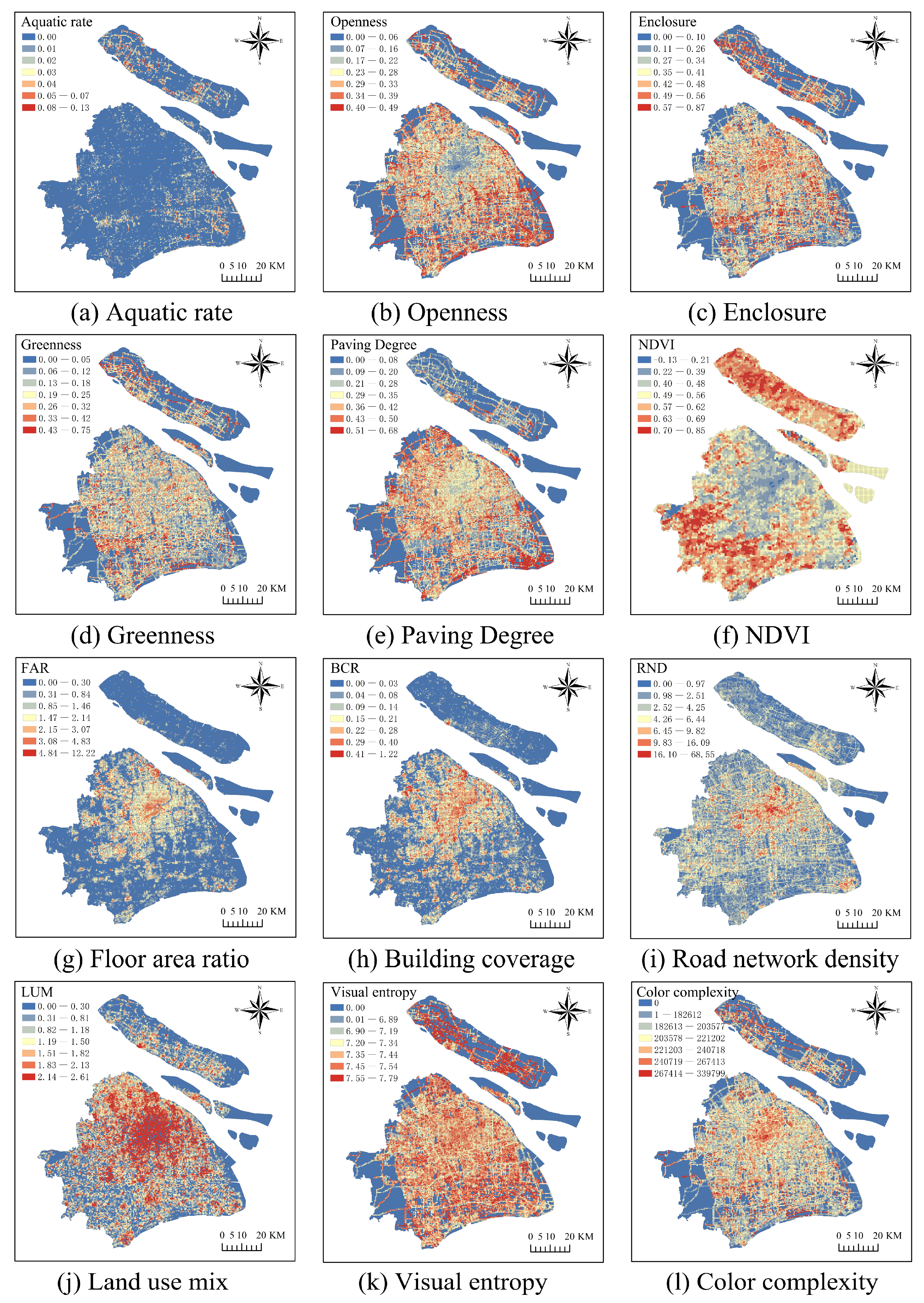 Figure 4 illustrates the spatial distribution patterns of streetscape and environmental factors at the 500 m grid scale in Shanghai, providing a spatial foundation for examining the nonlinear mechanisms that link residents’ sentiments with landscape environments during heatwaves. (a) AR is mainly concentrated along the Huangpu River, Suzhou Creek, and near-coastal zones, while values are generally low within the urban core. (b) OP is higher in suburban and waterfront open areas, whereas it is significantly reduced in central districts due to dense high-rise buildings. (c) EN is more pronounced in the area between the inner and middle rings and in the core of Pudong, reflecting highly concentrated street-space forms. (d) GR forms continuous high-value zones in peripheral new towns, large green spaces, and riparian green corridors, while remaining lower in central business districts and high-density residential areas. (e) PD is higher along arterial roads and in core commercial areas, but lower in residential side streets and neighborhoods adjacent to green spaces. (f) NDVI shows a spatial pattern consistent with GR, with high-value zones in Chongming Island and peripheral areas, and a patchwork of low values in the urban core. (g) FAR is elevated in central districts and the core of Pudong, decreasing gradually toward peripheral areas. (h) BCR is higher in older high-density neighborhoods and industrial or commercial areas, and lower in low-density suburban residential zones. (i) RND forms a core high-value area in the central districts and exhibits belt-shaped patterns along radial arterials and ring roads. (j) LUM is more pronounced in key functional areas such as Lujiazui, Xujiahui, Hongqiao, and Wujiaochang. (k) VE reaches higher values in street spaces with high functional diversity and complex interfaces, while being lower in waterfront open areas and large green spaces. (l) CC is higher in commercial corridors and mixed-use street blocks, but lower in areas dominated by green space, water bodies, or single-use industrial land. Overall, the central urban area is characterized by high EN, FAR, and RND, along with low OP and GR, suggesting that residents’ sentiments may be more vulnerable to negative impacts. In contrast, peripheral and waterfront areas, with greater OP and GR, show stronger potential to alleviate negative sentiments under heatwaves, providing an important reference for subsequent exploration of nonlinear relationships between streetscapes and sentiments.