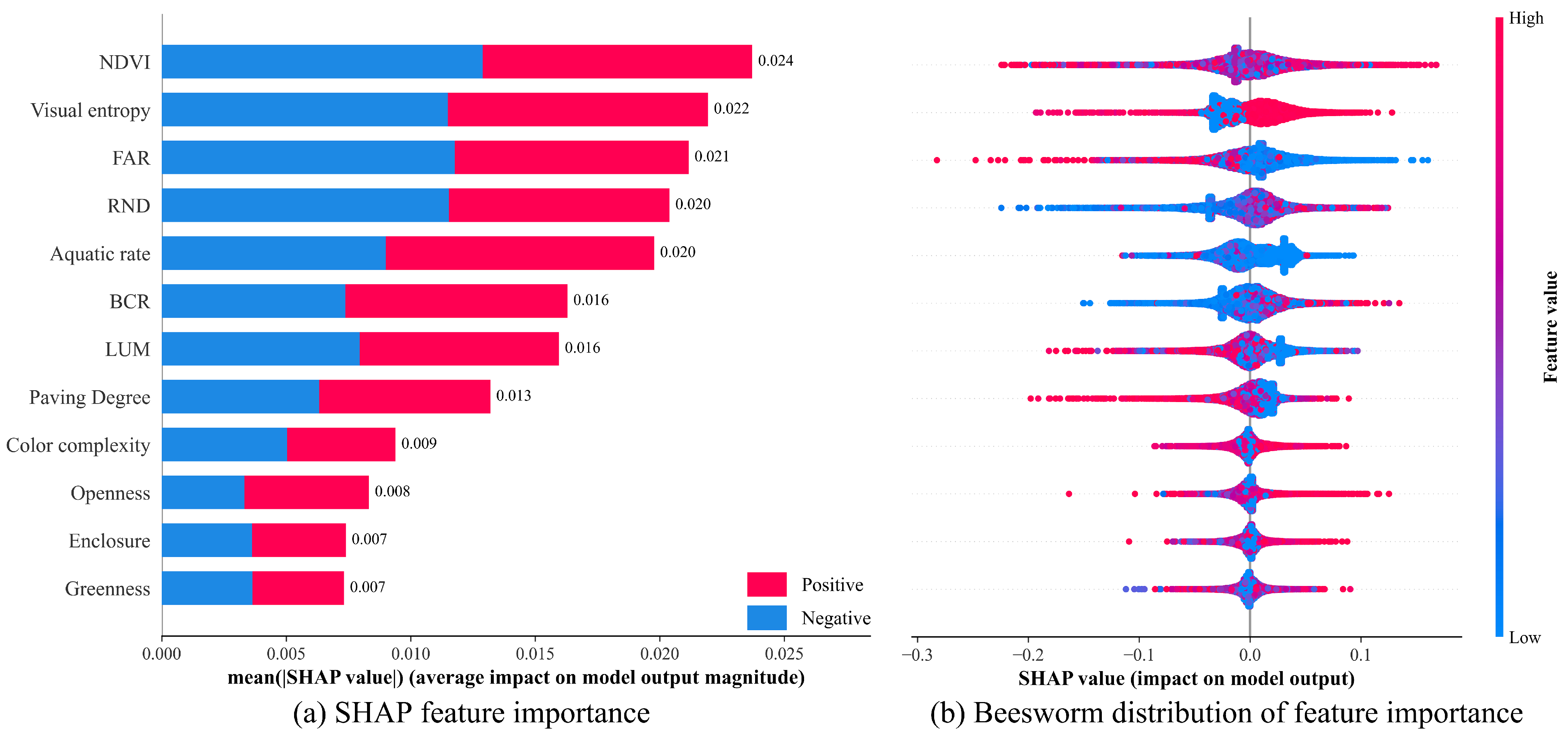 This section employs SHAP global feature importance and beeswarm plots to analyze the interactions between streetscapes and the sentiment index during heatwaves. As shown in the left panel of Figure 5, NDVI (0.024), VE (0.022), FAR (0.021), RND (0.020), and AR (0.020) ranked highest in contribution. BCR (0.016) and LUM (0.016) followed as secondary factors. PD (0.013) showed stable but relatively weak effects, while CC (0.009), OP (0.008), EN (0.007), and GR (0.007) were overall weaker contributors.