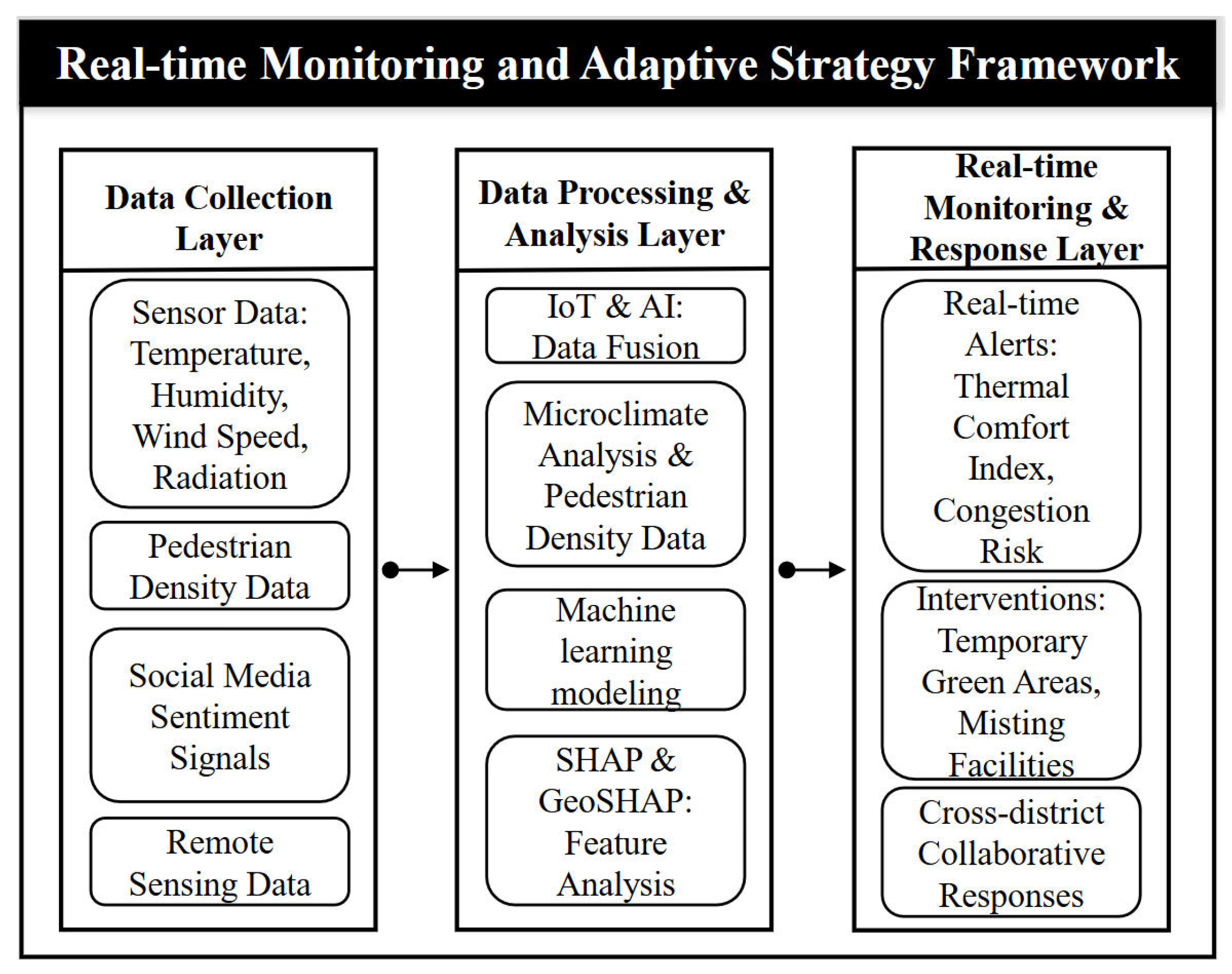 Under heatwave conditions, the impact of street environments on residents’ sentiments is highly dynamic, and static planning is insufficient to respond to rapid changes in microclimates and pedestrian flows. This study finds that relying solely on averaged indicators risks overlooking localized imbalances caused by heat stress peaks and congestion hotspots, thereby weakening the overall buffering effect. Therefore, establishing real-time evaluation and dynamic regulation mechanisms is essential for enhancing street resilience and sentimental well-being. A monitoring system based on the Internet of Things (IoT) and artificial intelligence (AI) is recommended, integrating microclimate parameters (temperature, humidity, wind speed, and radiation), pedestrian density, and sentimental signals derived from social media or mobile devices into an urban sensing platform [66]. Using fixed and mobile micro-stations, mobile phone signaling, anonymous video counting, and remote sensing data combined with edge computing, minute-level diagnostics and risk warnings can be achieved at the street-segment scale [67]. Furthermore, by integrating SHAP and GeoSHAP model outputs, an “sentimental risk score” can be dynamically updated for minute-level warnings and diversion, hourly evaluations and adjustments, and daily hotspot identification and threshold revision, thereby establishing a multi-scale, spatiotemporal governance system. At the strategic level, machine learning predictions and digital twin models can be employed for feedforward interventions [68]. When road network density or green space functionality approaches critical thresholds, temporary green areas can be activated as substitute buffer zones. Additionally, responsibility checklists and assessment mechanisms should be established at the block level, covering factors such as sensor uptime, threshold accuracy, response timeliness, and the rebound amplitude of the sentiment index. Real-time alerts for the “thermal comfort index” and “congestion risk level” can enhance residents’ risk perception and proactive avoidance capacity, while fostering rapid collaborative responses from communities and businesses. Overall, real-time monitoring and dynamic governance can transform model-based evidence into operational protocols, creating a closed loop of sensing, feedback, and intervention that allows streets to adaptively regulate under extreme heat conditions (Figure 10).