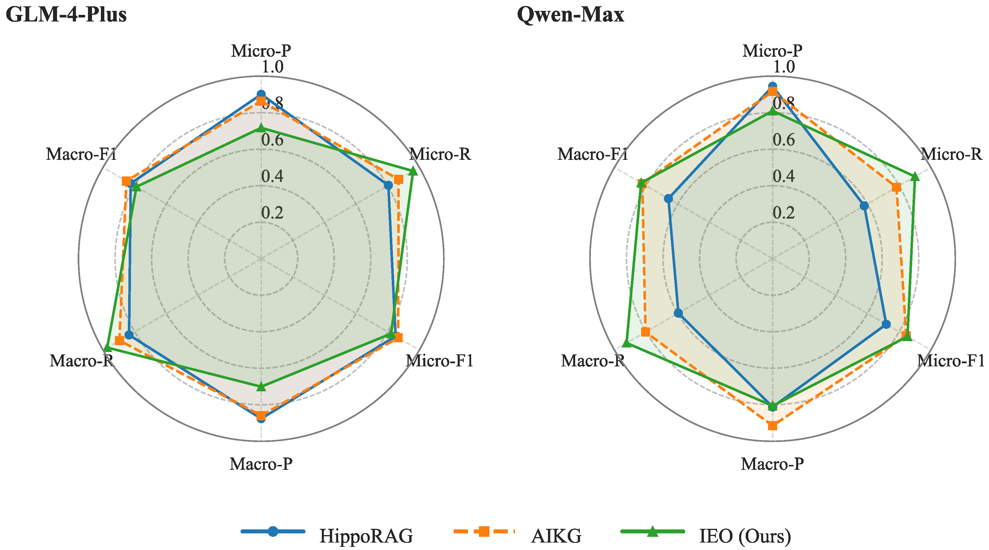 - While achieving a high recall rate, the IEO framework maintains a good F1 comprehensive performance, indicating a good balance between knowledge coverage and accuracy. The framework demonstrates robust performance across different large language models, showcasing the potential universality of its methodology.