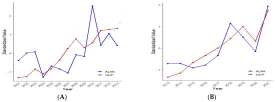 As this figure shows, from 2001 to 2004, both ALAN and GDP show a general decline, with standardized values of ALAN dropping below those of GDP in 2004. Although the overall alignment between ALAN and GDP is noticeable, ALAN appears to be more volatile and exhibits more pronounced fluctuations, exhibiting a sharp peak around 2010 and a subsequent drop; from 2013 onwards, GDP increases steadily. ALAN also increases, albeit with some minor fluctuations before a notable dip for both ALAN and GDP around 2020 that is likely to correspond to the period of the COVID-19 pandemic. This dip is followed by a sharp recovery and a surge in both indicators in 2021. The visual alignment between ALAN and GDP appears stronger and more consistent compared to Figure 3A, especially in the later years (2017–2021) and during the 2020 downturn and subsequent rebound.
