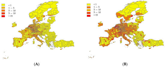GDP per capita (A,B) estimated for NUTS-3 regions. (A) GDP in 2001 (Million € per km2) (B)—GDP in the year 2021 (Million € per km2).