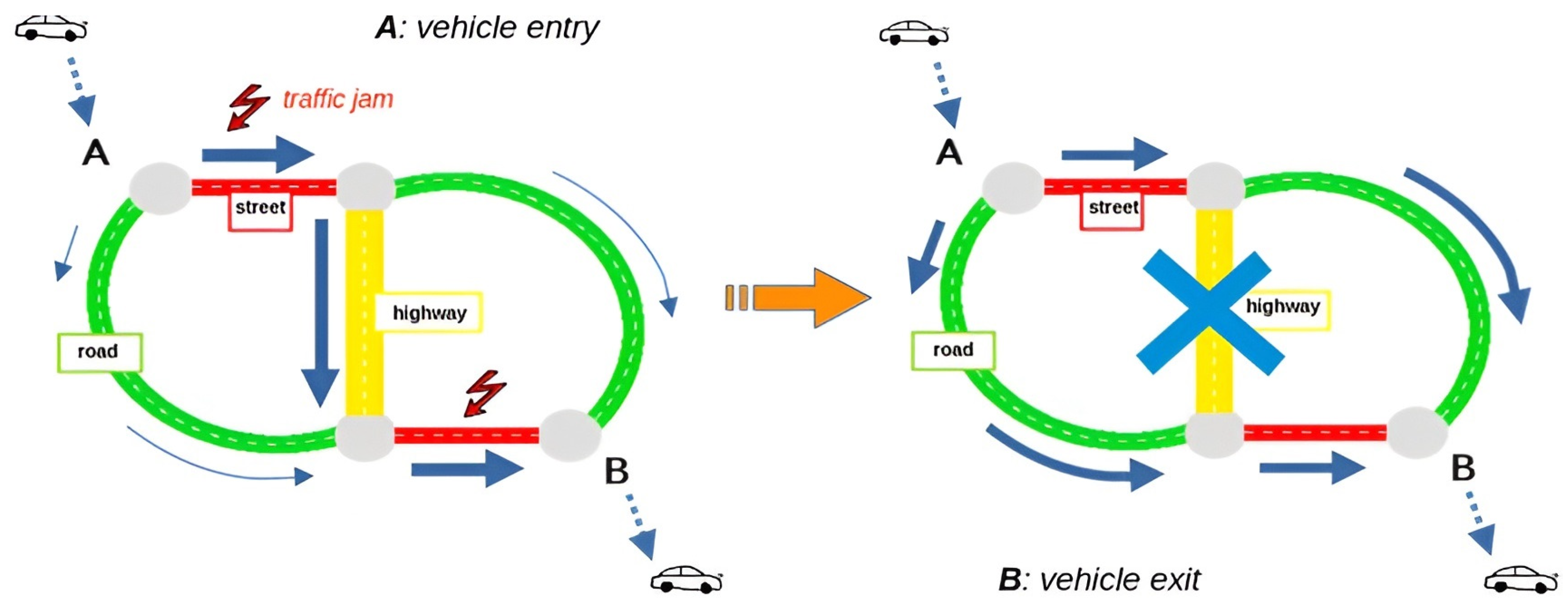 - Pigou-Knight-Downs Paradox [14,15]: adding a faster or higher-capacity route can unintentionally increase travel times. When drivers prioritize the quickest route, the new capacity may attract excess traffic, leading to congestion. This paradox underscores the need for network-wide considerations, particularly in roundabout corridors where isolated improvements may disrupt overall performance;