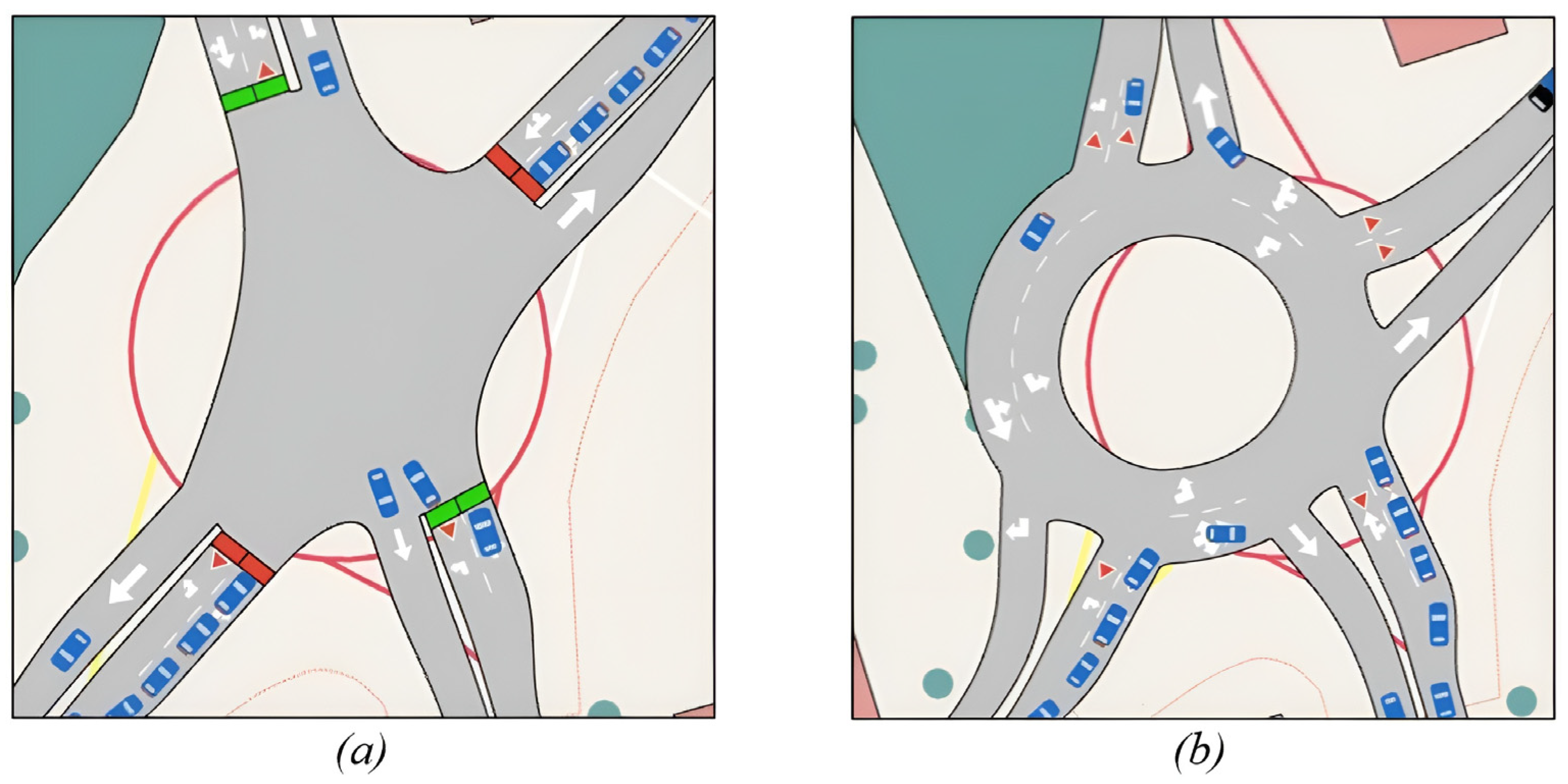 - Guerrieri, M.; Khanmohamadi, M. COM-Roundabout: The first smart commutable and self-regulating roundabout for HDVs and CAVs. Int. J. Transp. Sci. Technol. 2025, in press. [Google Scholar] [CrossRef]