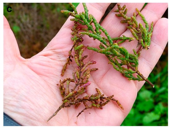 Salicornia spp. have a plethora of applications and potential, ranging from their ancient use as an additive in the production of soap and glass [33,34] to their recent environmental protection uses as a plant biofilter for marine aquaculture effluent [35] or as a viable source of biofuel for aviation [36].