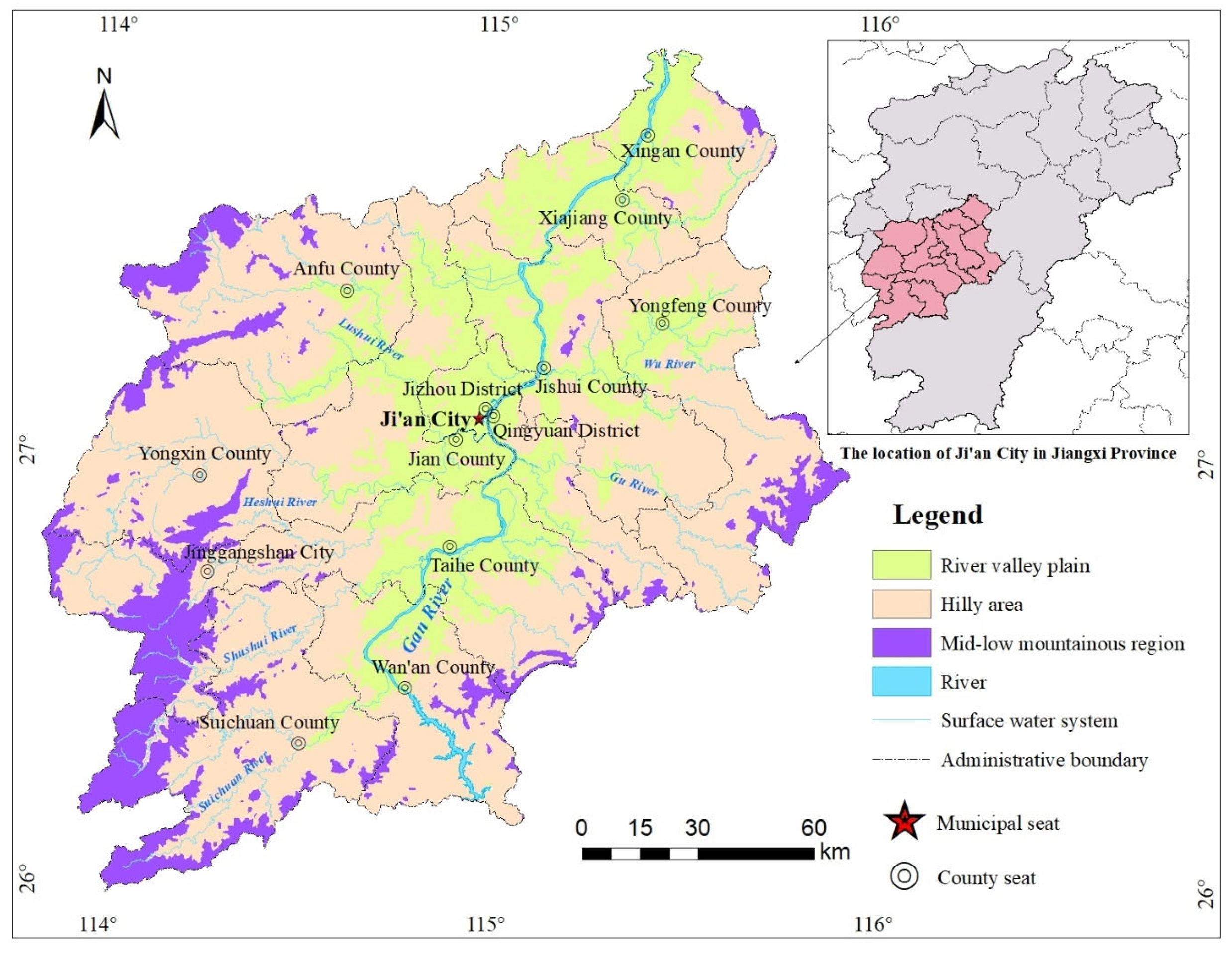 - Li, Y.T.; Wang, H.; Hu, H.J.; Fang, Y.H. Analysis of climate change characteristics in Ji’an City from 1960 to 2020. South-Central Agric. Sci. Technol. 2024, 45, 120–124. (In Chinese) [Google Scholar]