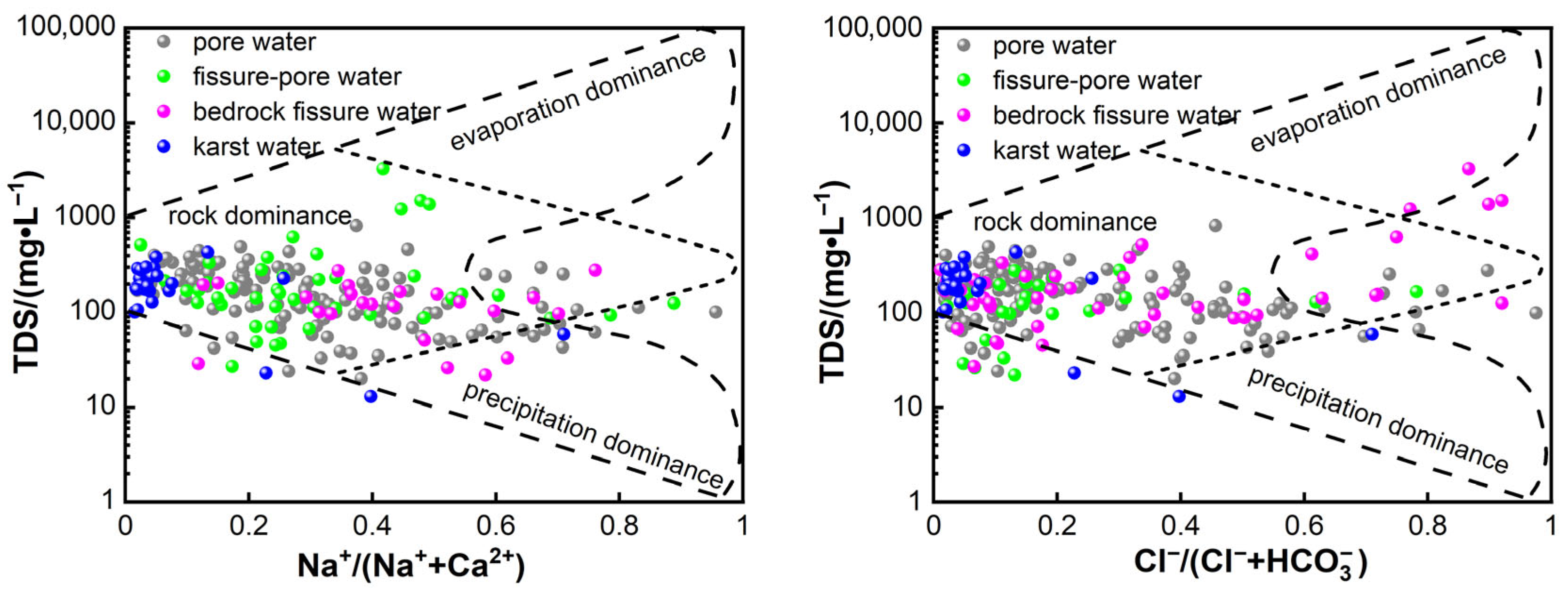 - Zhang, Y.; Liu, J.; Zhang, Y. Hydrochemical evolution of shallow and deep groundwater in Tongchuan city, China. J. Coastal Res. 2015, 73, 436–442. [Google Scholar] [CrossRef]