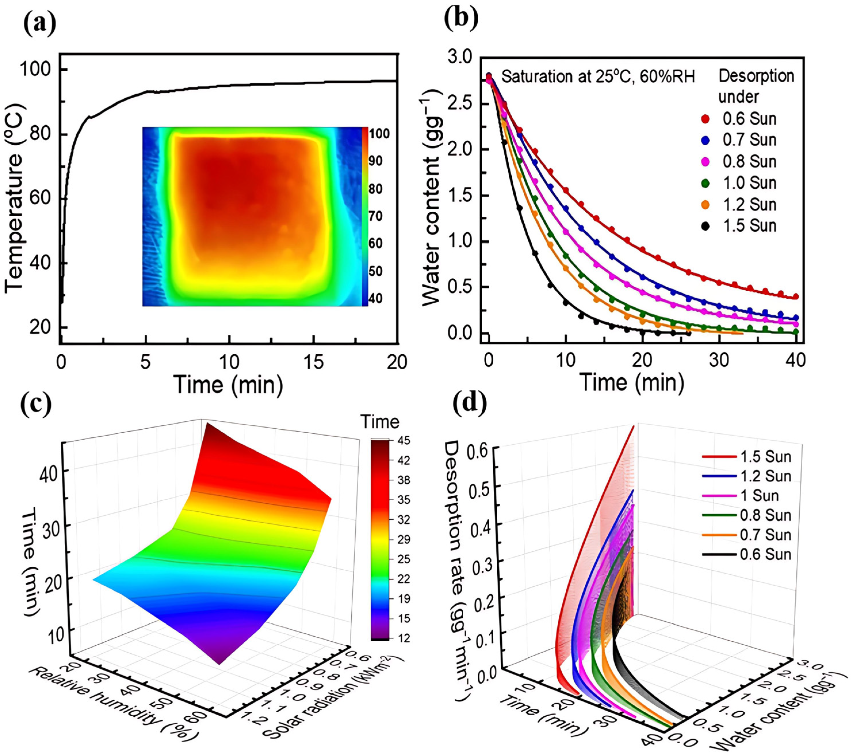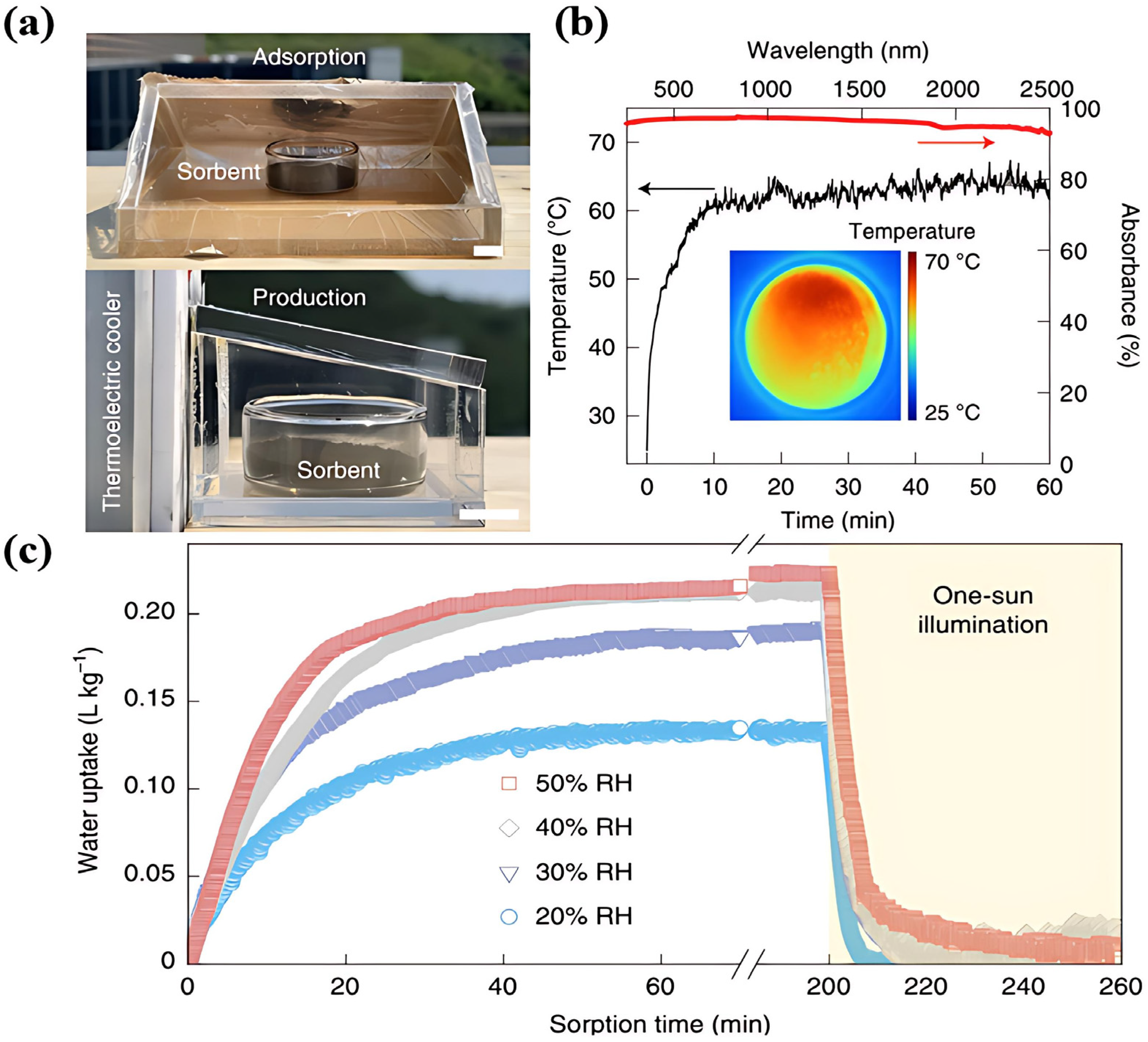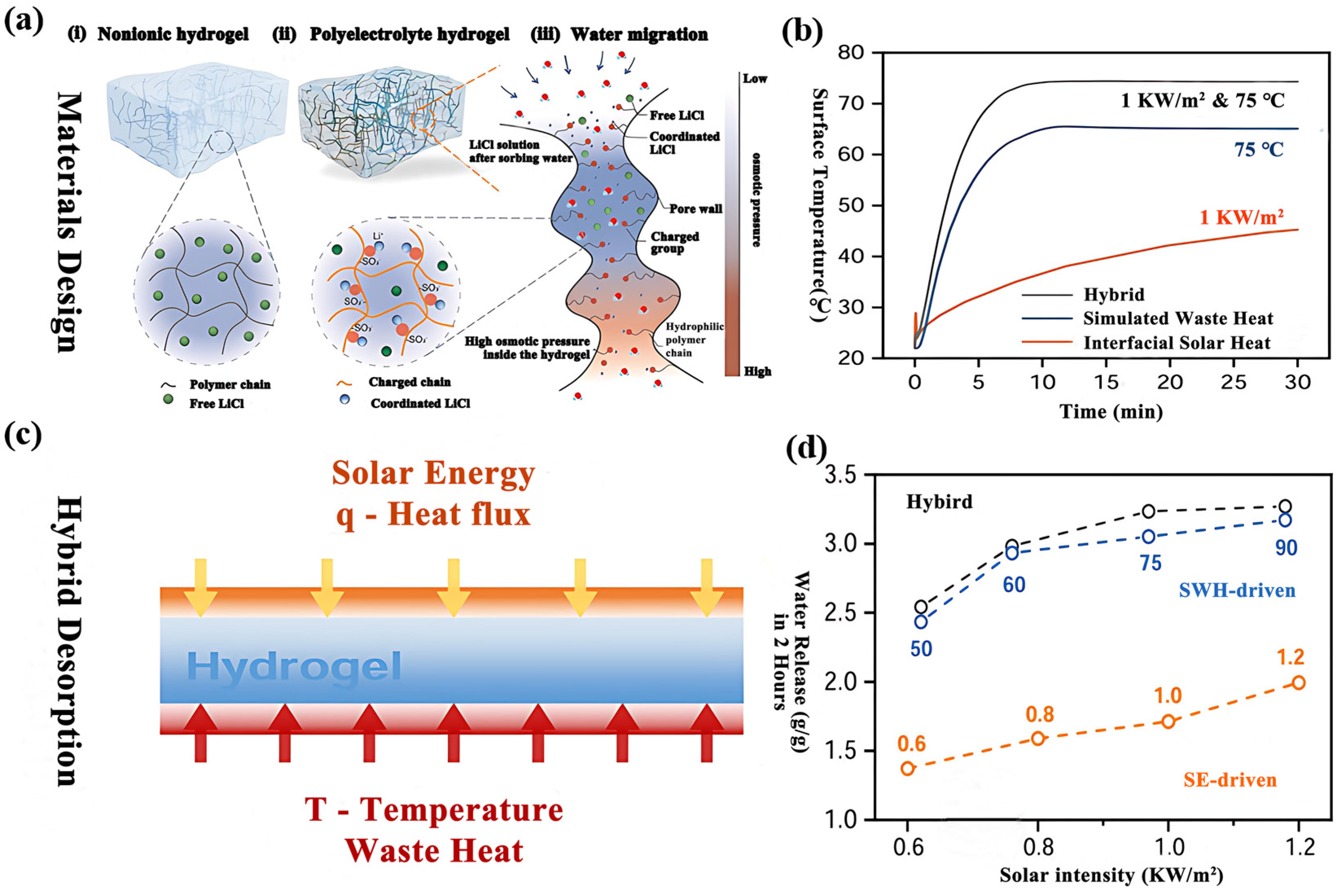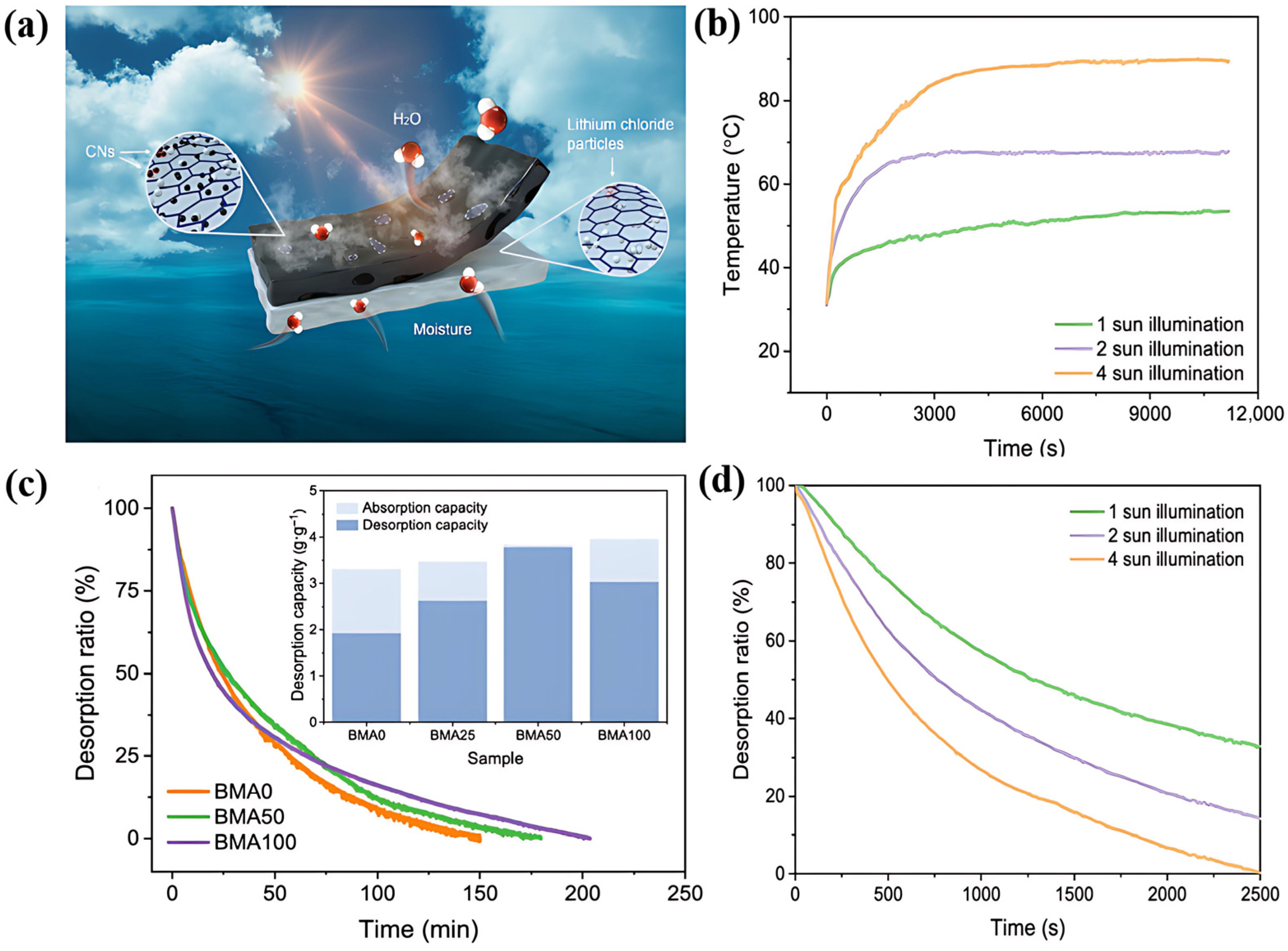 - Lignin, a wood-based material, is renewable, biocompatible, and degradable, and its intramolecular conjugated structure enhances light absorption through the π-π stacking effect, while the hydrogen bonding network formed by the natural hydroxyl functional groups and water molecules significantly improves the low humidity adsorption capacity, which can be utilized to dynamically adjust the lignin photothermal properties, coupled with the cellulose hydrogel network and the temperature-sensitive polymers (e.g., PNIPAM), to construct a humidity response system. Adsorption affinity can be dynamically adjusted to enhance solar energy utilization to break through the bottleneck of low humidity water harvesting.