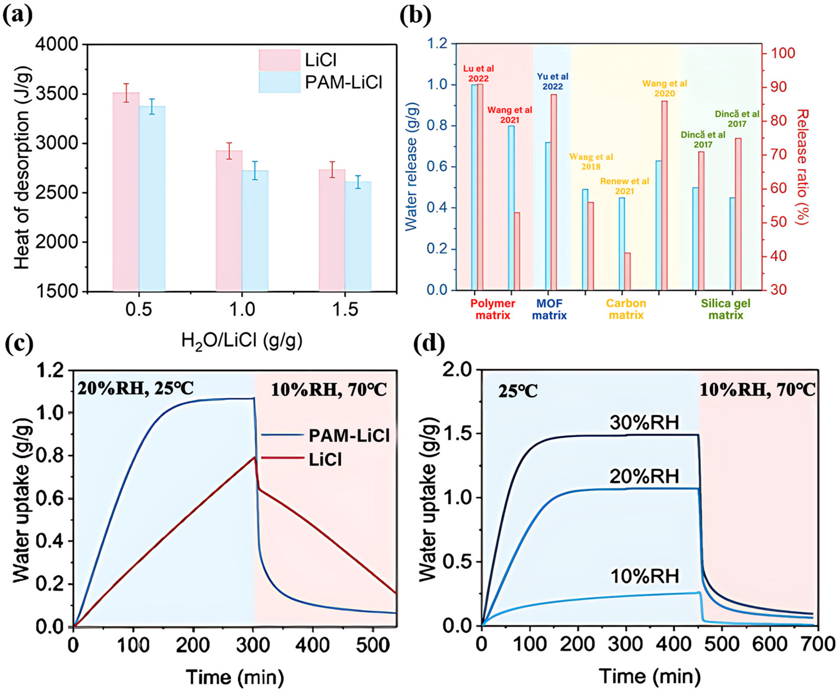 | [poly-NIPAM] hydrogel | 10–40 °C | 40–85% | 0.5–2.0 kg/kg | Temperature responsive, adjustable adsorption; High humidity adsorption improvement is not obvious | [112] |