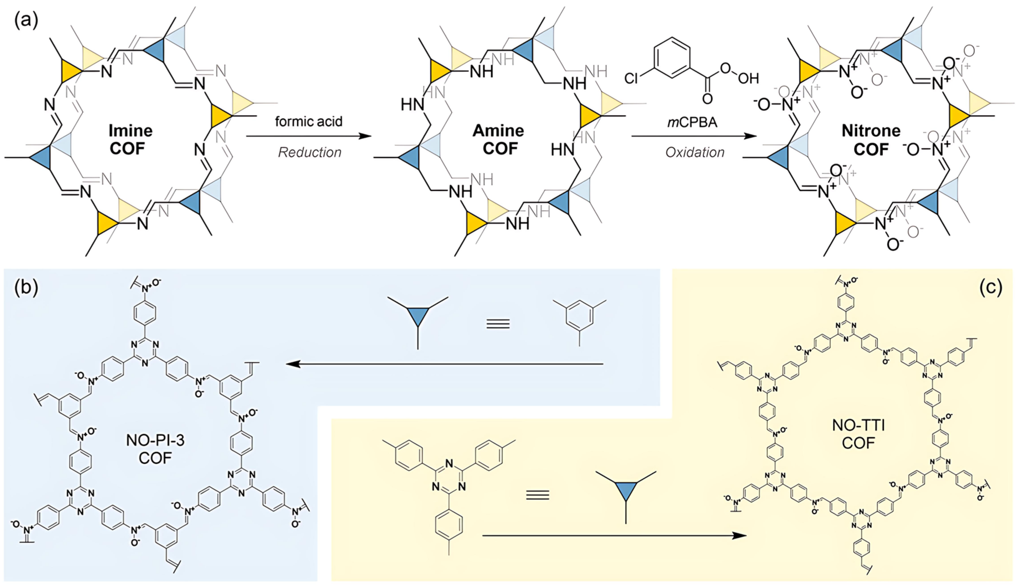 - Grunenberg, L.; Savasci, G.K.; Emmerling, S.T.; Heck, F.; Bette, S.; Cima Bergesch, A.; Ochsenfeld, C.; Lotsch, B.V. Postsynthetic transformation of imine-into nitrone-linked covalent organic frameworks for atmospheric water harvesting at decreased humidity. J. Am. Chem. Soc. 2023, 145, 13241–13248. [Google Scholar] [CrossRef]