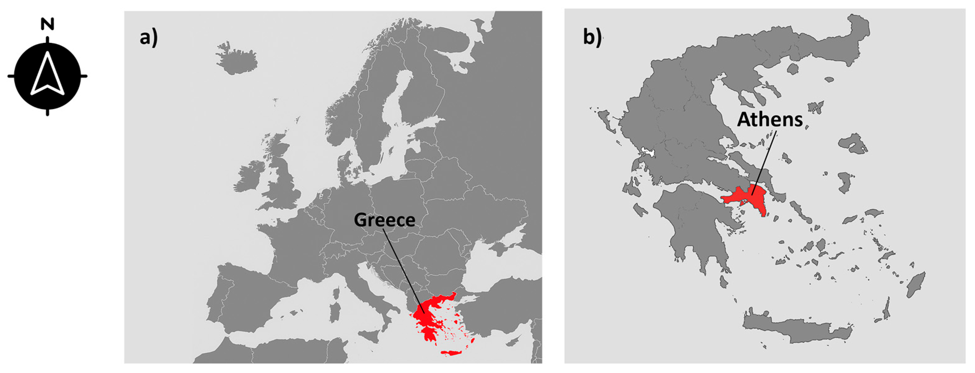 - Macrotrends. Athens, Greece Metro Area Population (1950–2025). Macrotrends LLC 2025. Available online: https://www.macrotrends.net/global-metrics/cities/21113/athens/population (accessed on 20 June 2025).