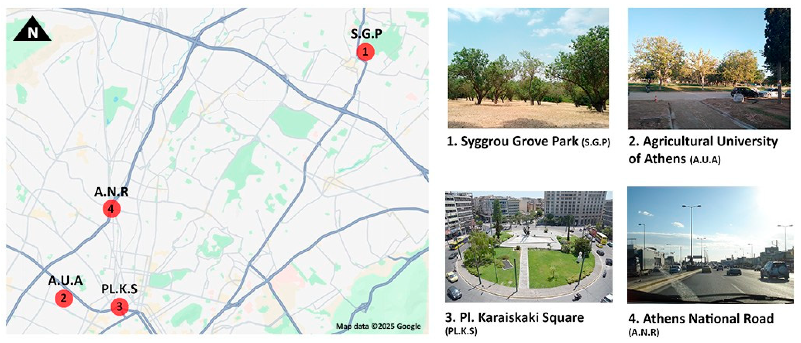 - Athens National Road (A.N.R.)—a heavily trafficked industrial corridor with negligible vegetation cover, representing the lower extreme of the gradient.