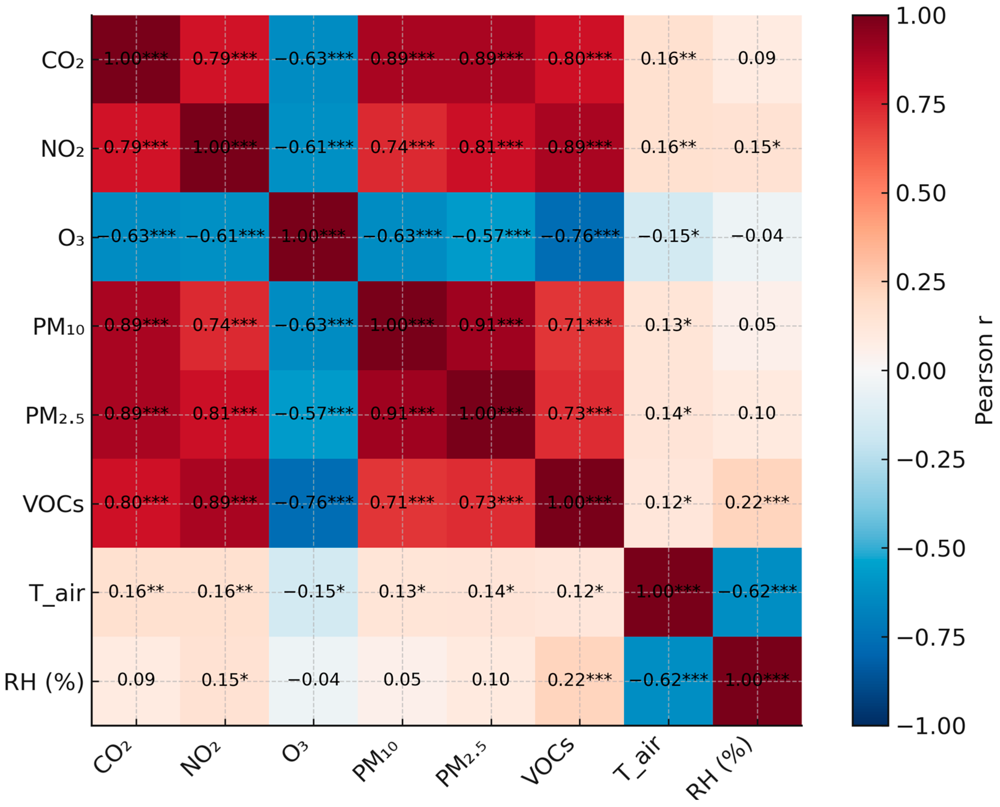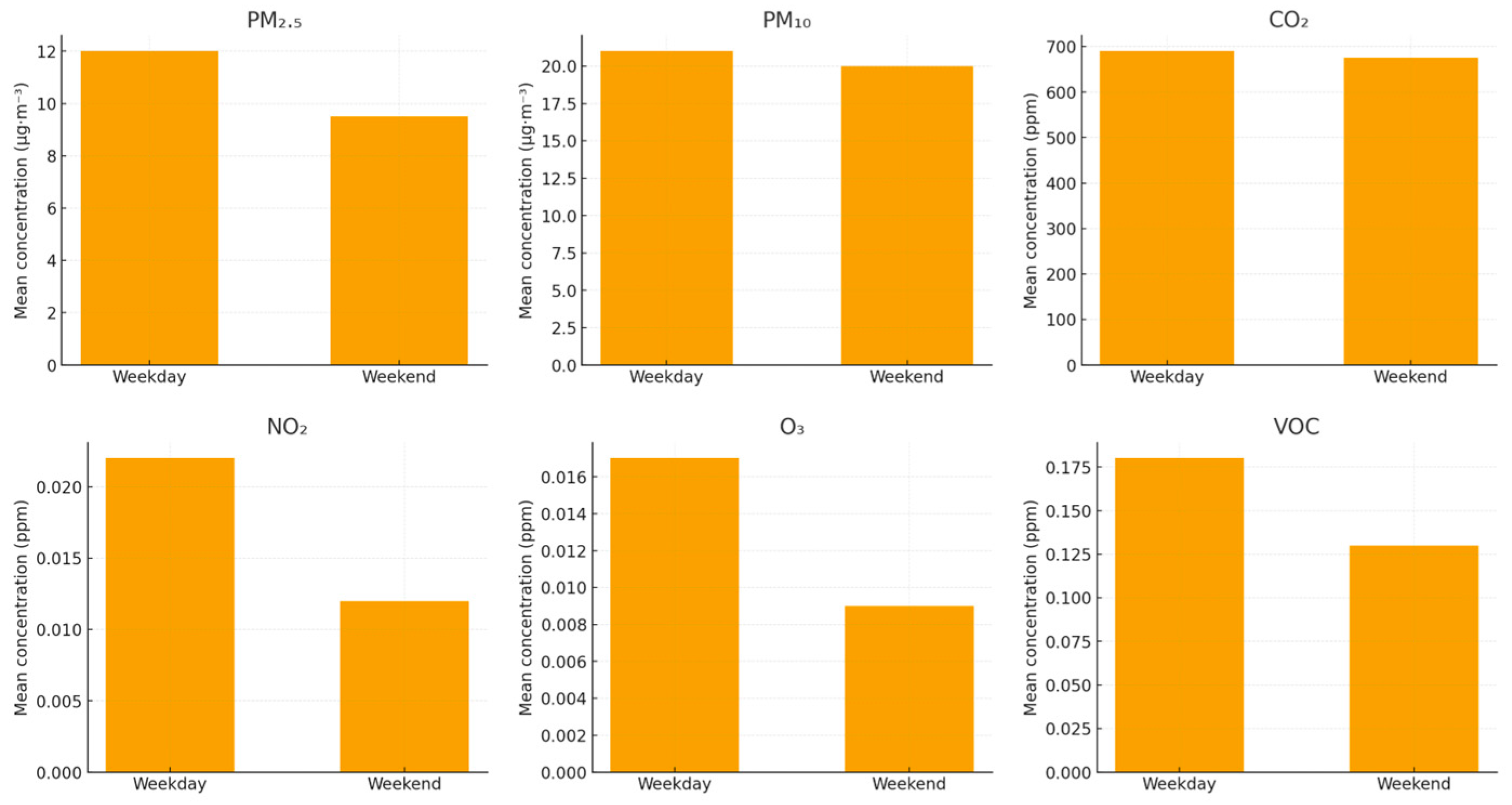 - Day-type (Weekday − Weekend): PM2.5 (µg·m−3) Δ = −2.7, p = 0.042; NO2 (ppm) Δ = −0.0098, p = 0.035; O3 (ppm) Δ = −0.0072, p = 0.040; PM10, CO2, and VOCs: n.s.
