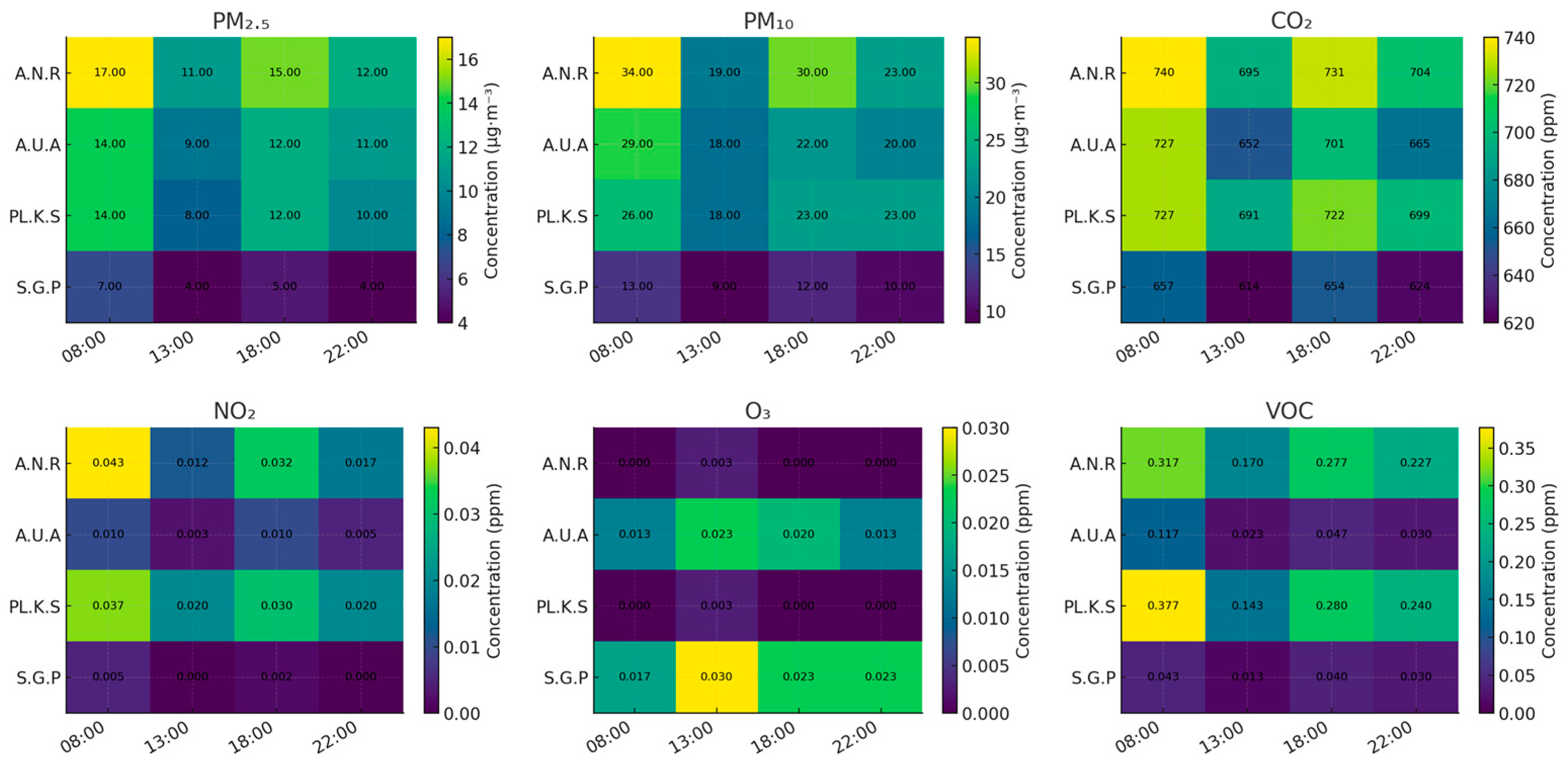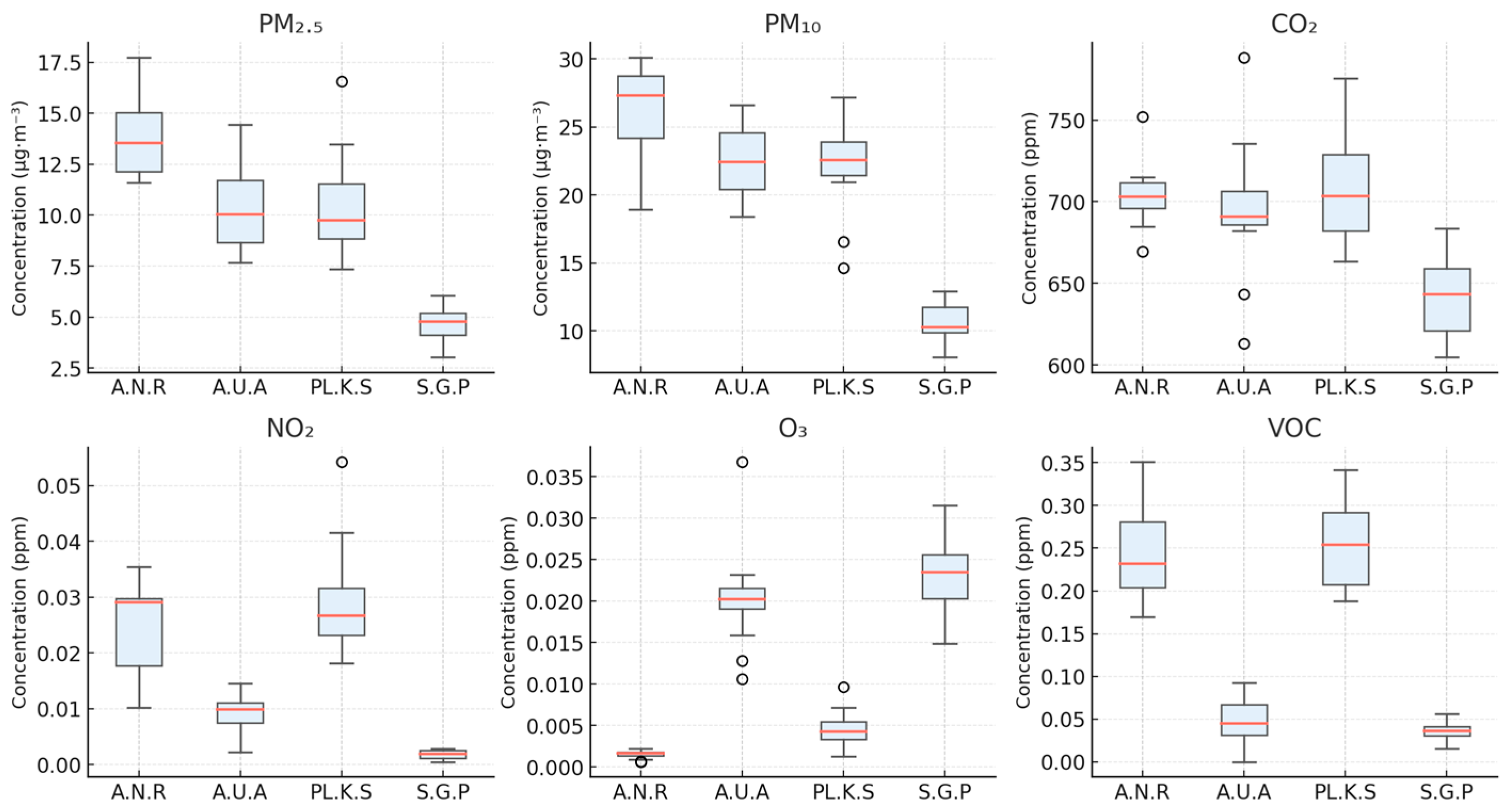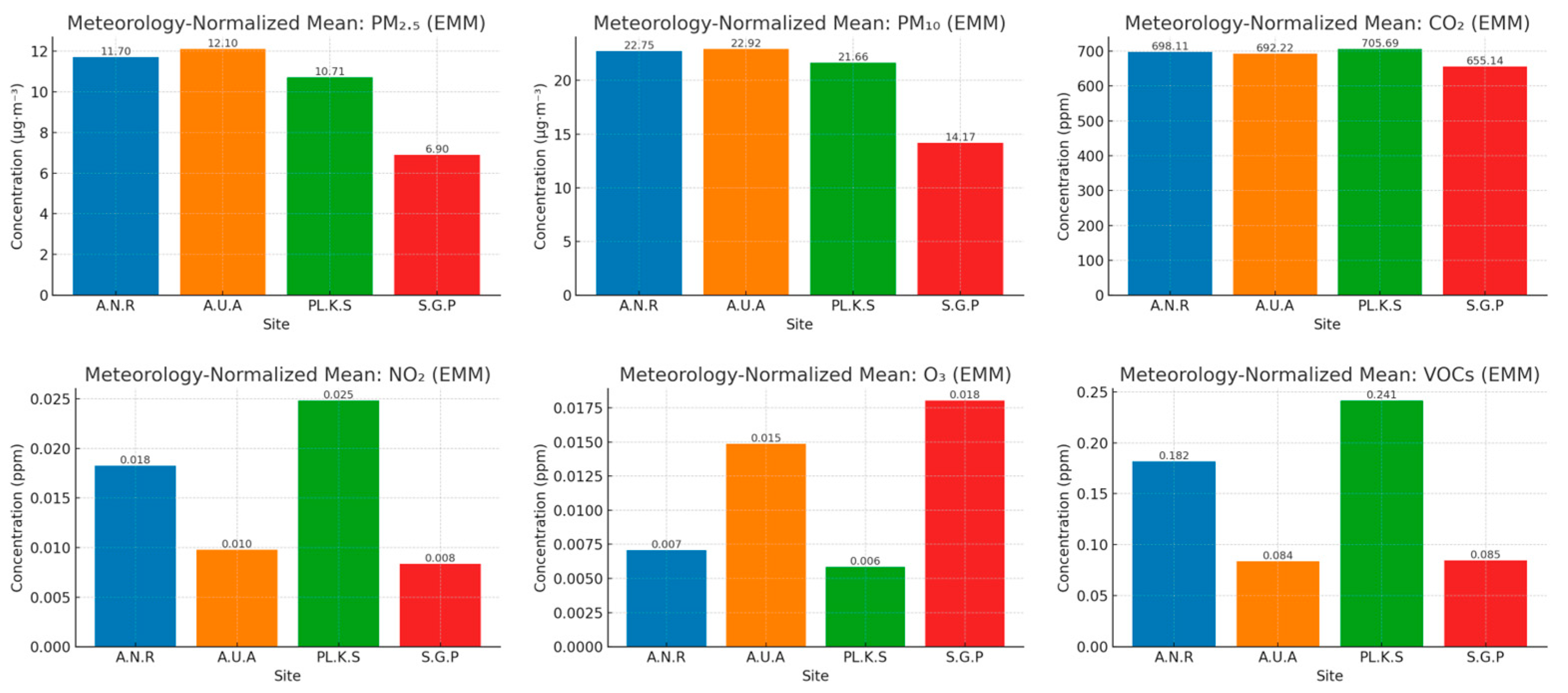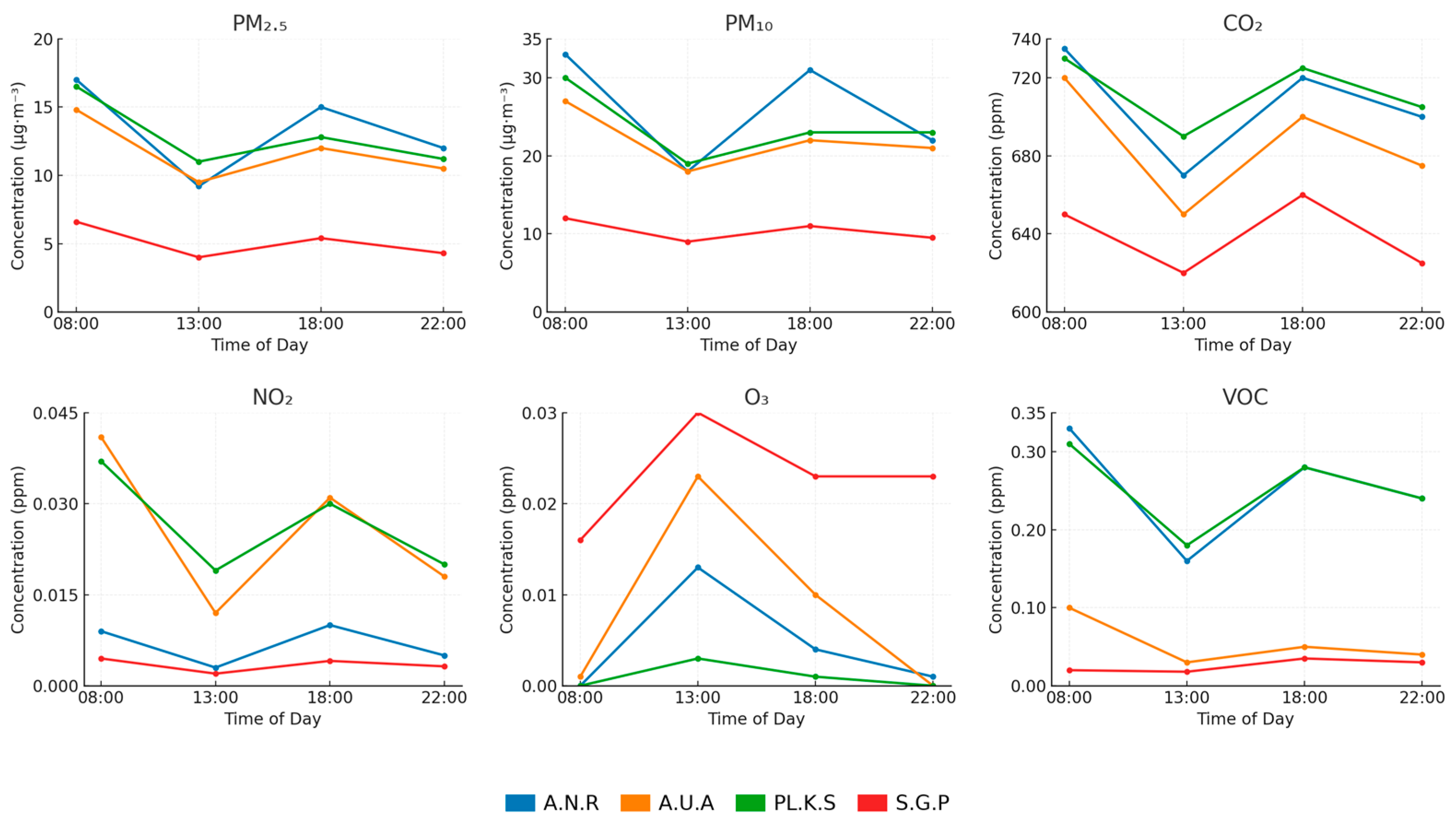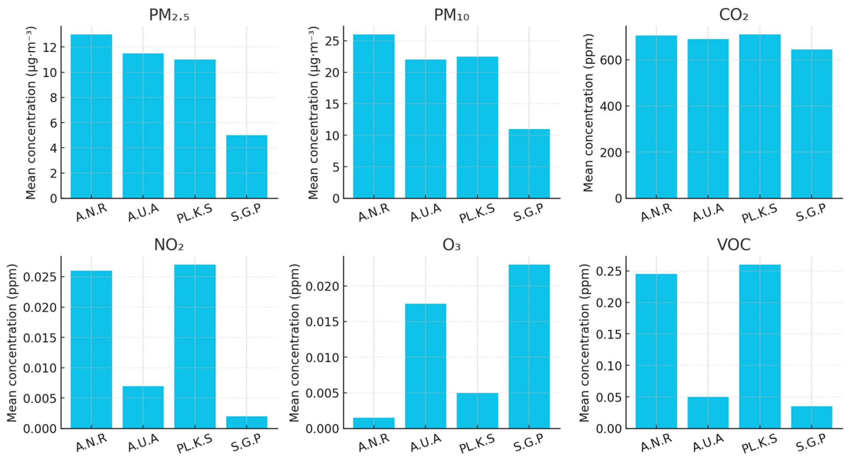 - VOCs (ppm): Lowest at S.G.P., differing from A.N.R. (Δ = −0.218, p < 0.001) and PL.K.S. (Δ = −0.230, p < 0.001); the contrast with A.U.A. was not significant (Δ = −0.024, n.s.).