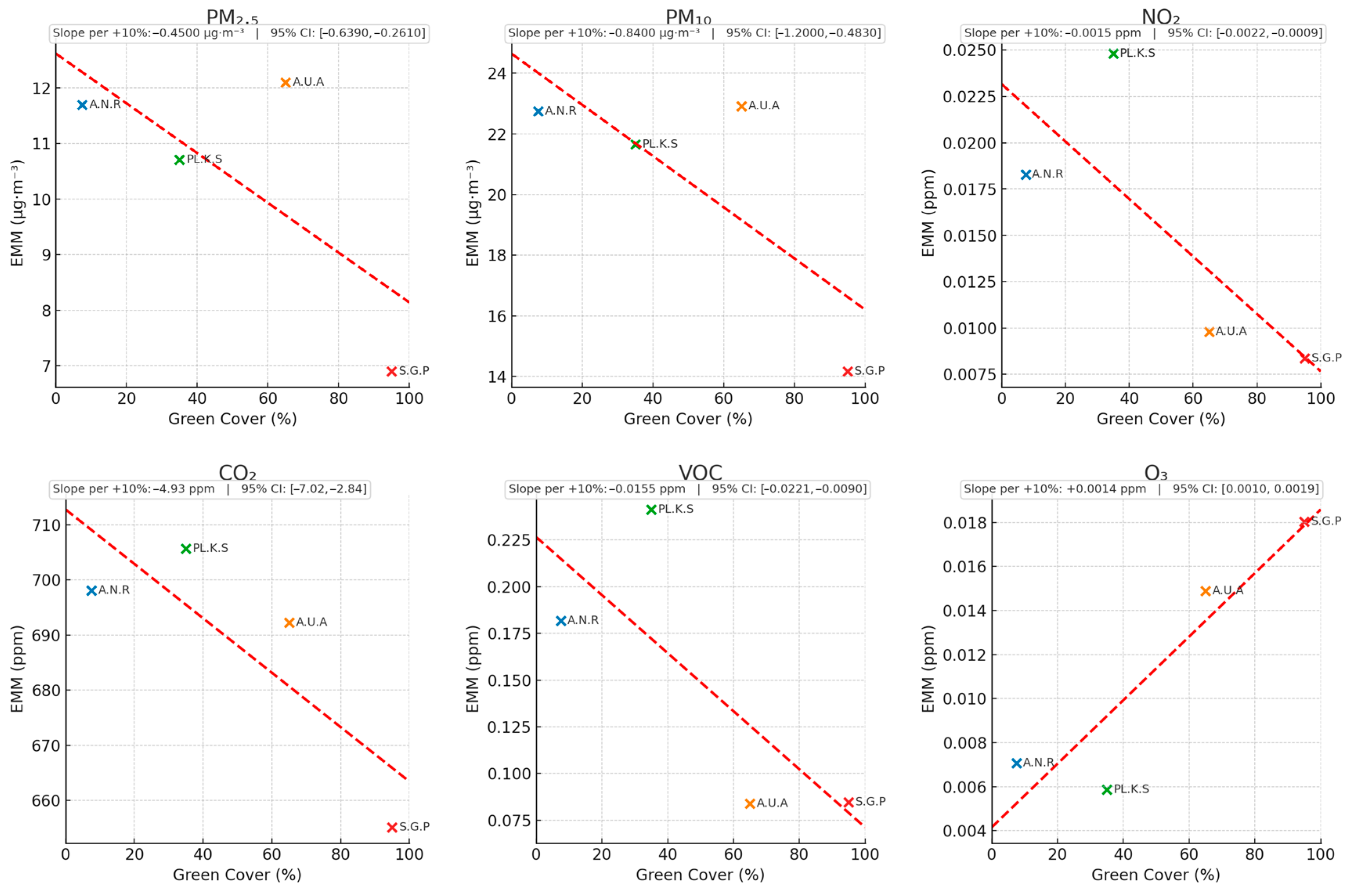 - Particulate Matter (PM2.5, PM10): The reductions observed with increasing vegetation are consistent with leaf-surface capture mechanisms, particularly effective for coarse and fine particles. The greater slope for PM10 than PM2.5 suggests that coarse particles, with higher deposition velocities, benefit more from interception, whereas PM2.5 removal also depends on longer-term diffusion processes.