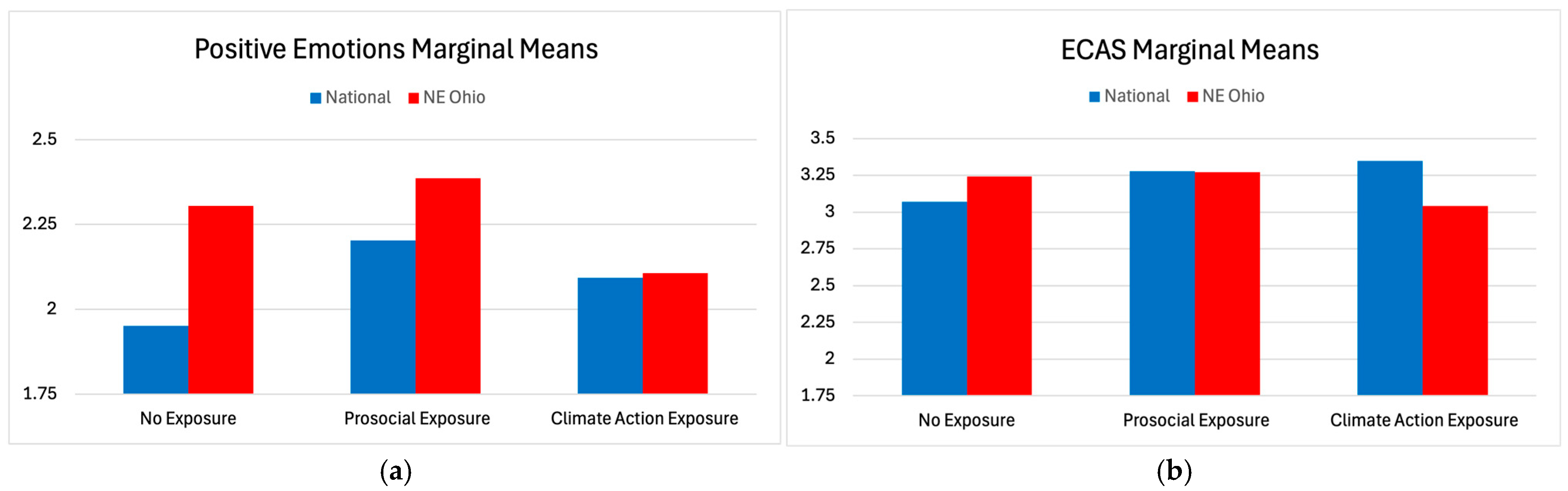 - CV content will elicit a greater response from the regional NE Ohio sample than from the national sample. Specifically, relative to the national sample, we expected the NE Ohio sample to exhibit increased norms, decreased psychological distance, increased ECAS, increased behavioral efficacy, and increased policy support. The rationale for these regional-impact hypotheses is that we anticipate that NE Ohio residents will identify with NE Ohio-derived CV content more strongly than participants who do not live in NE Ohio.