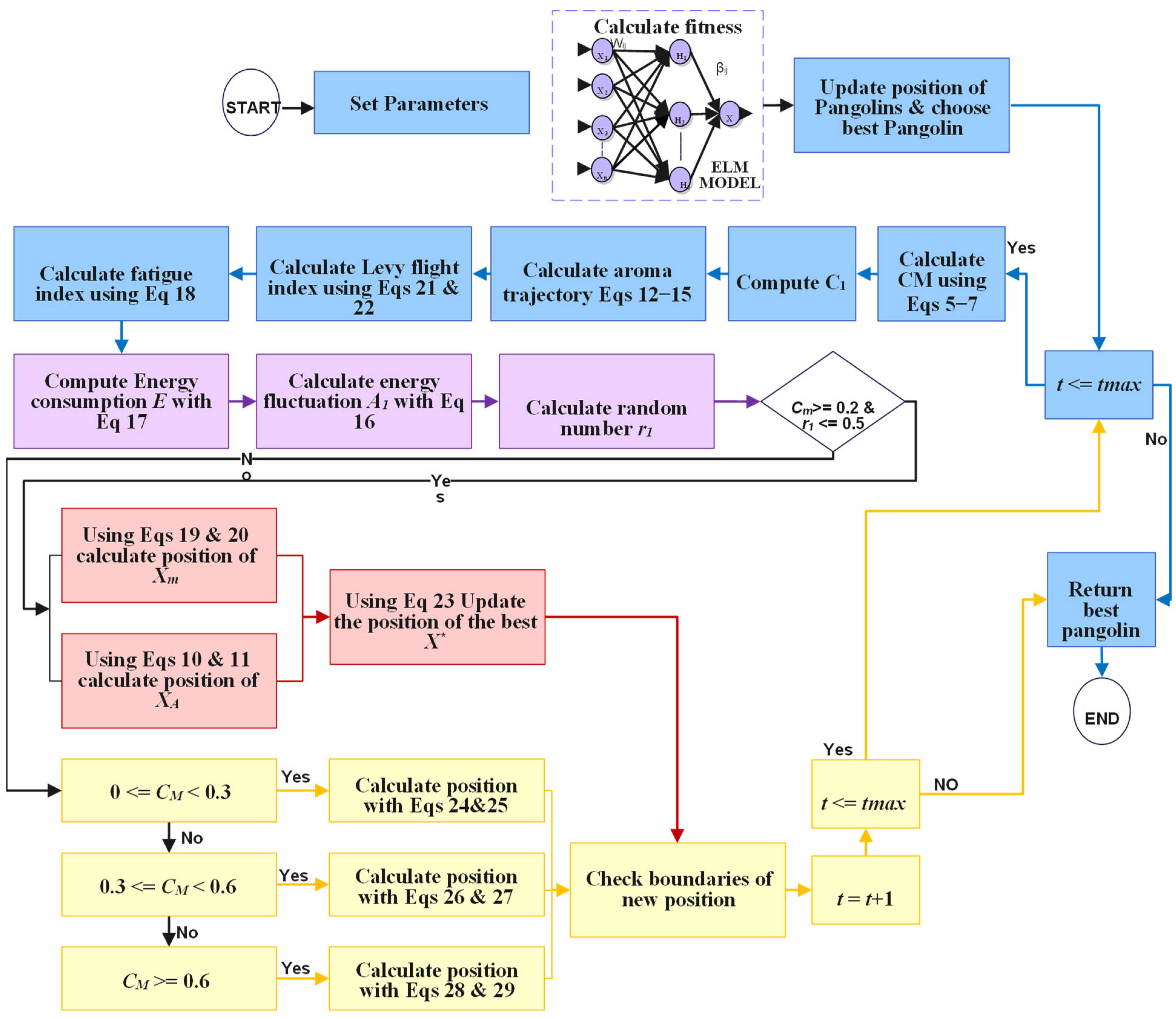 Our approach builds on this agenda by introducing a new nature-inspired optimizer, the Chinese Pangolin Optimizer (CPO), and coupling it with ELMs to form a hybrid CPO–ELM predictor. The Chinese pangolin (Manis pentadactyla) is a nocturnal, myrmecophagous mammal whose foraging ecology combines targeted excavation of prey-rich patches with adaptive movement across heterogeneous terrain; empirical studies describe how burrow site selection depends on slope, canopy cover, and proximity to ant nests, and how activity rhythms and home ranges adjust to resource density [