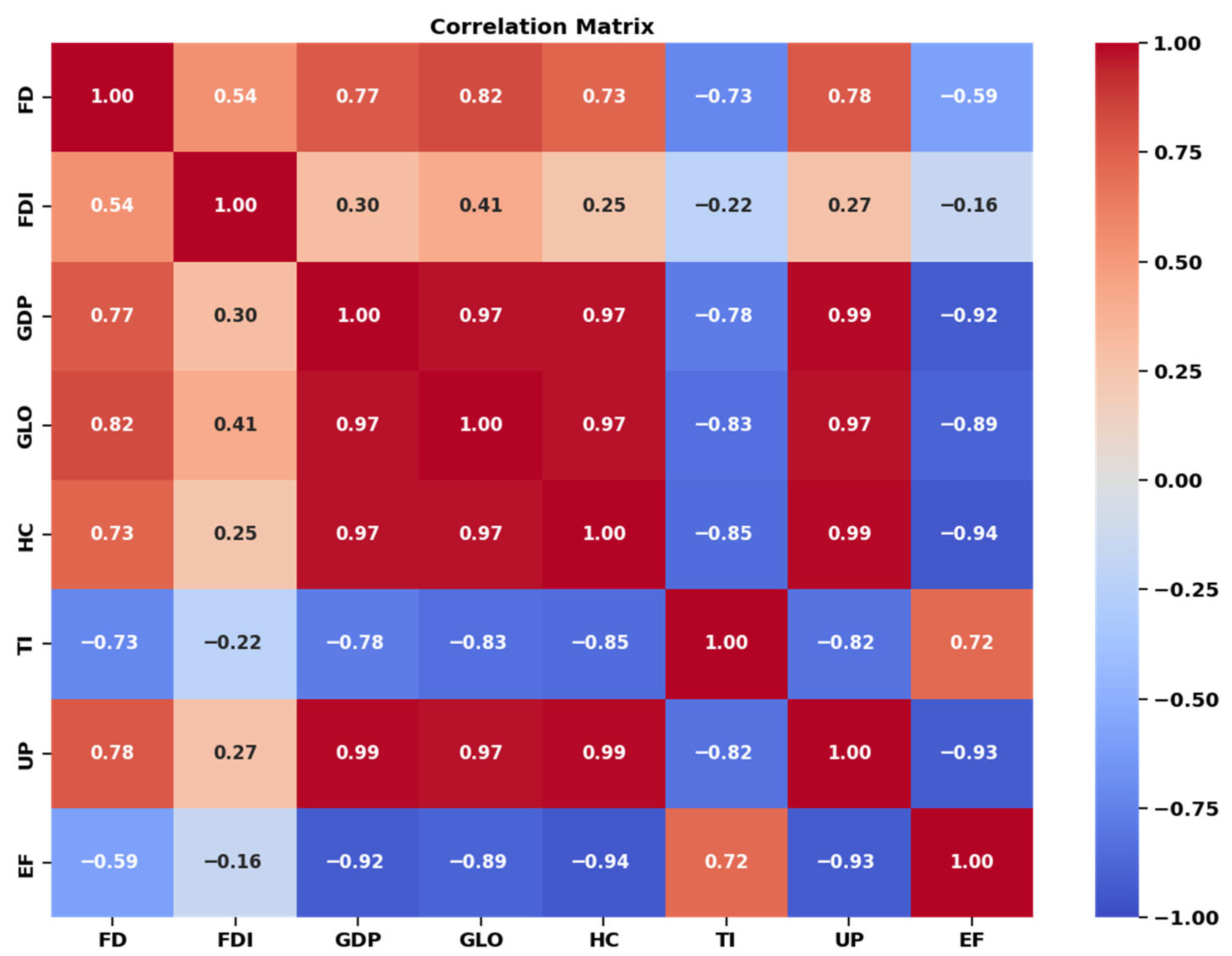 3]. Studies focusing on globalization suggest heterogeneous effects: while some panels report that broader integration amplifies EF in developing regions, others find regime-dependent or statistically insignificant relationships once cross-sectional dependence and slope heterogeneity are addressed [