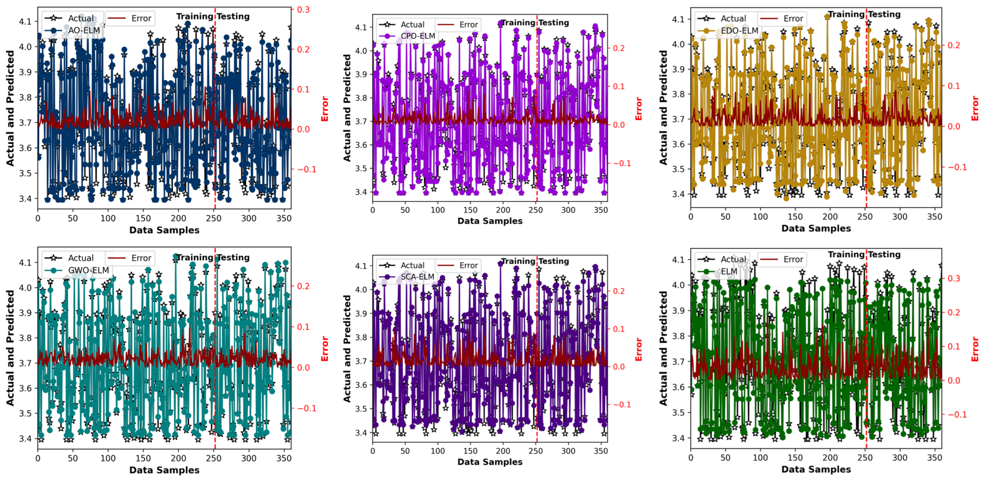 Figure 5 provide a visual depiction of the models’ performance in approximating the ecological footprint over the full dataset. Each subplot corresponds to a distinct ELM-based model: the AO-ELM, CPO-ELM, EDO-ELM, GWO-ELM, SCA-ELM, and standalone ELM. The black star markers represent the actual ecological footprint values, while the colored lines denote the predicted outputs of each model. The red line, plotted along the secondary