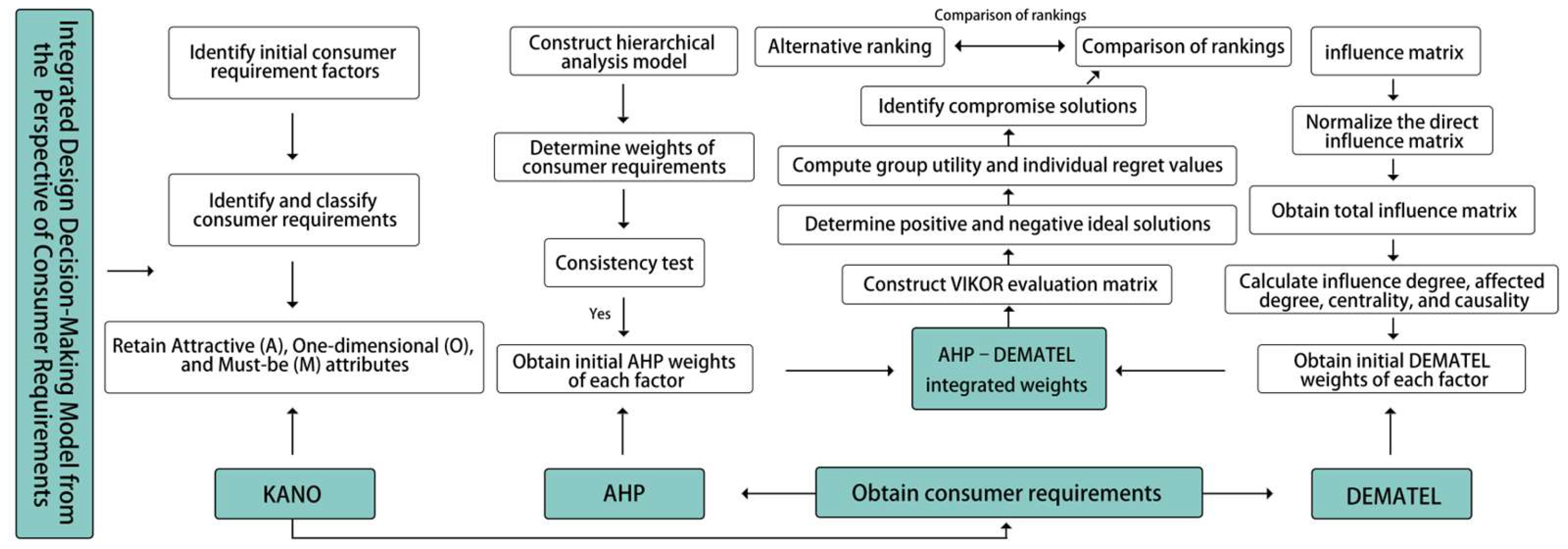Building upon this methodological foundation, the present study proposes a KANO–AHP–DEMATEL–VIKOR–based decision-making framework for MCCP design, focusing on the following research questions:
