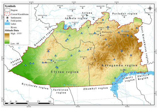 Central Kazakhstan, located in the central part of the republic, includes Karaganda and Ulytau oblasts. Its length is 600 km from north to south and 1100 km from east to west, with an area of 427.98 thousand km2. The region borders Akmola and Pavlodar oblasts in the north, Abai and Almaty oblasts in the east, Zhambyl, Turkestan and Kyzylorda oblasts in the south, Aktobe and Kostanay oblasts in the west. Lake Balkhash is located in the south-east (Figure 1). The total length of the region’s borders is about 4 thousand km.