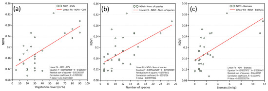 Correlation between NDVI and field-based vegetation indicators: (a) projective cover; (b) species richness; (c) aboveground biomass.