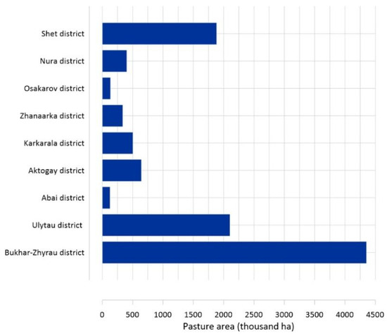 The results of the analysis revealed significant disparities in pasture availability across the regions of Central Kazakhstan as shown in Figure 3. The Bukhar-Zhyrau district had the largest area of pastures within settlements (4354.9 thousand ha), which significantly exceeded the corresponding figures for other districts. High values were also observed in the Ulytau (2103.9 thousand ha) and Shet (1884.0 thousand ha) districts, indicating a strong potential for pasture husbandry development. Conversely, low availability of pasturelands was recorded in the Abai (126.7 thousand ha) and Osakarov (134.6 thousand ha) districts, which may have limited the potential for intensive cattle breeding in these areas. These results underscored the need for an adaptive land-use policy aimed at the rational allocation and restoration of pasture resources to address regional imbalances.