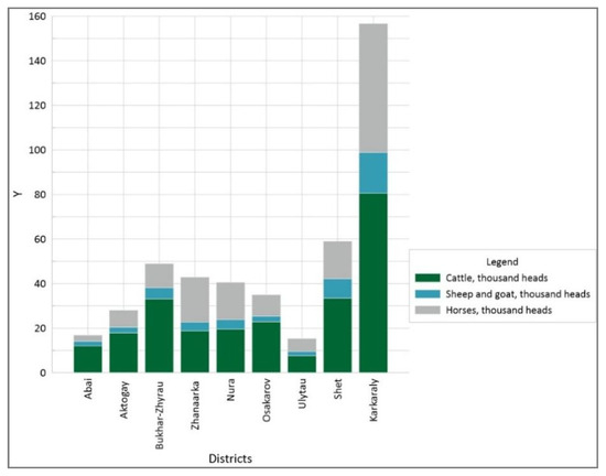 The rational use of pastures is directly related to the number of farm animals and their grazing load [26,38]. The imbalance between the bearing capacity of land and the number of livestock leads to accelerated degradation of vegetation, especially in an arid climate. Based on statistical data for the period from 1998 to 2023, there are clear trends in the number of cattle, as well as sheep and goats in the districts of the regions of Central Kazakhstan. Current information as of 2024 is presented in Figure 4 below.
