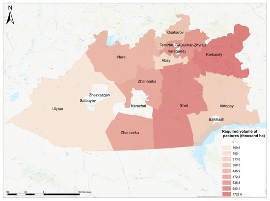 As shown in Figure 5, the largest required volume of pastures is recorded in the Karkarala district (1723.6 thousand ha) due to the high number of livestock and favourable natural and climatic conditions for grazing. A significant need is also noted in the Shet (650.1 thousand ha) and Bukhar-Zhyrau (538.8 thousand ha) districts, where cattle breeding is one of the leading agricultural activities.