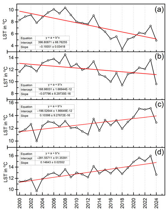 To assess the long-term trend of LST, annual mean surface temperature values were generated for each year. A time series of 25 values (2000–2024) was constructed for each pixel. A linear trend model was then fitted to each time series in the form: