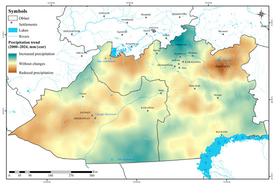 The present study was based on data obtained from Kazhydromet bulletins [29], statistical yearbooks of the National Bureau of Statistics of the Republic of Kazakhstan [30], and the Ministry of Agriculture, as well as meteorological records on air temperature and precipitation for the period 2000–2024. To assess the spatiotemporal variability of precipitation during the growing season (May–September), continuous long-term observations from regional meteorological stations (1994–2024) were analyzed.