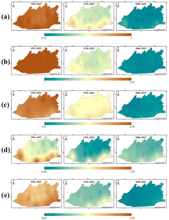 Figure 7 shows the long-term trend in land surface temperature, reflecting the dynamics of thermal change over the study period. Significant warming is observed across large areas in the south and west of the region, particularly in the Ulytau region and neighboring districts of the Karaganda region, including Zhezkazgan, Ulytau, Satpayev, Karazhal, and parts of the Balkhash area. These zones also exhibit the highest average temperatures, indicating a continued intensification of thermal stress. The combination of high current temperatures and a persistent upward trend sharply increases the climatic vulnerability of these areas. These zones are also characterized by the highest mean temperatures and show an increase in thermal stress over the observation period (Figure 8d). The combination of high temperatures and a persistent upward trend (0.146 °C yr−1; p < 0.0001) sharply heightens the climatic vulnerability of these areas (Table 1).