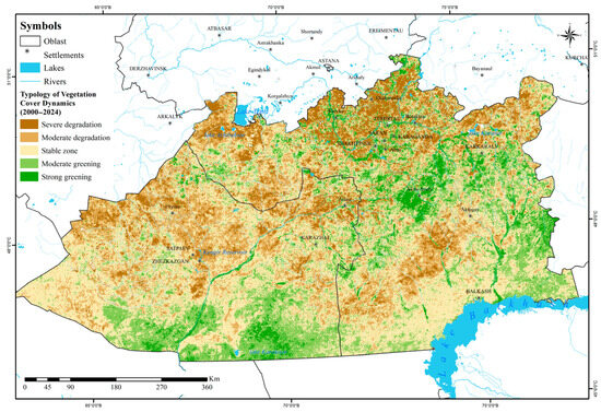 Between 2000 and 2024, 49.3% of Karazhal city’s territory was characterised by stable vegetation conditions. Similar situations were observed in the Shet (40.4%), Ulytau (45.8%) and Aktogay (49.8%) districts, where vegetation cover also remained relatively stable.