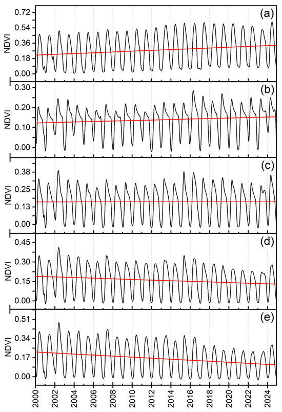 Long-term changes in NDVI and the OLS linear trend (2000–2024): (a) Strong greening; (b) Moderate greening; (c) Stable condition; (d) Moderate degradation; (e) Severe degradation. The red line represents the OLS linear trend.