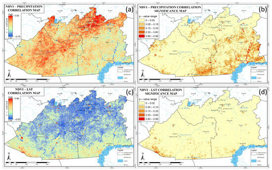 Maps of NDVI correlation with climatic factors: (a) NDVI–precipitation correlation, (b) significance of NDVI–precipitation correlation (p-value), (c) NDVI–LST correlation, (d) significance of NDVI–LST correlation (p-value).