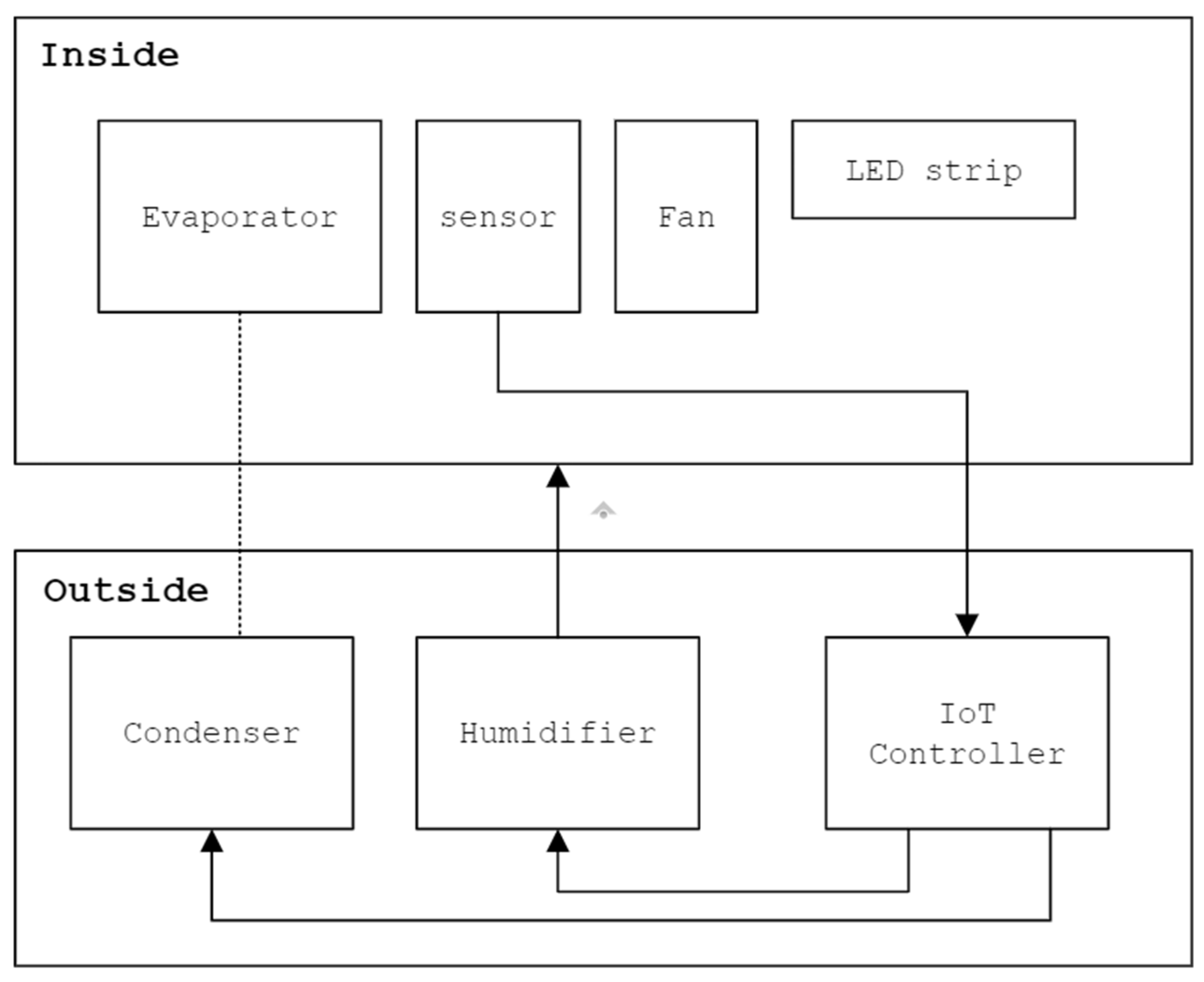 | [22] | 0.435 × 0.320 × 0.285 | 0.04 | Fully controlled | Humidity, air quality, temperature | Ultrasonic humidifier, fan, peltier | 2023 |