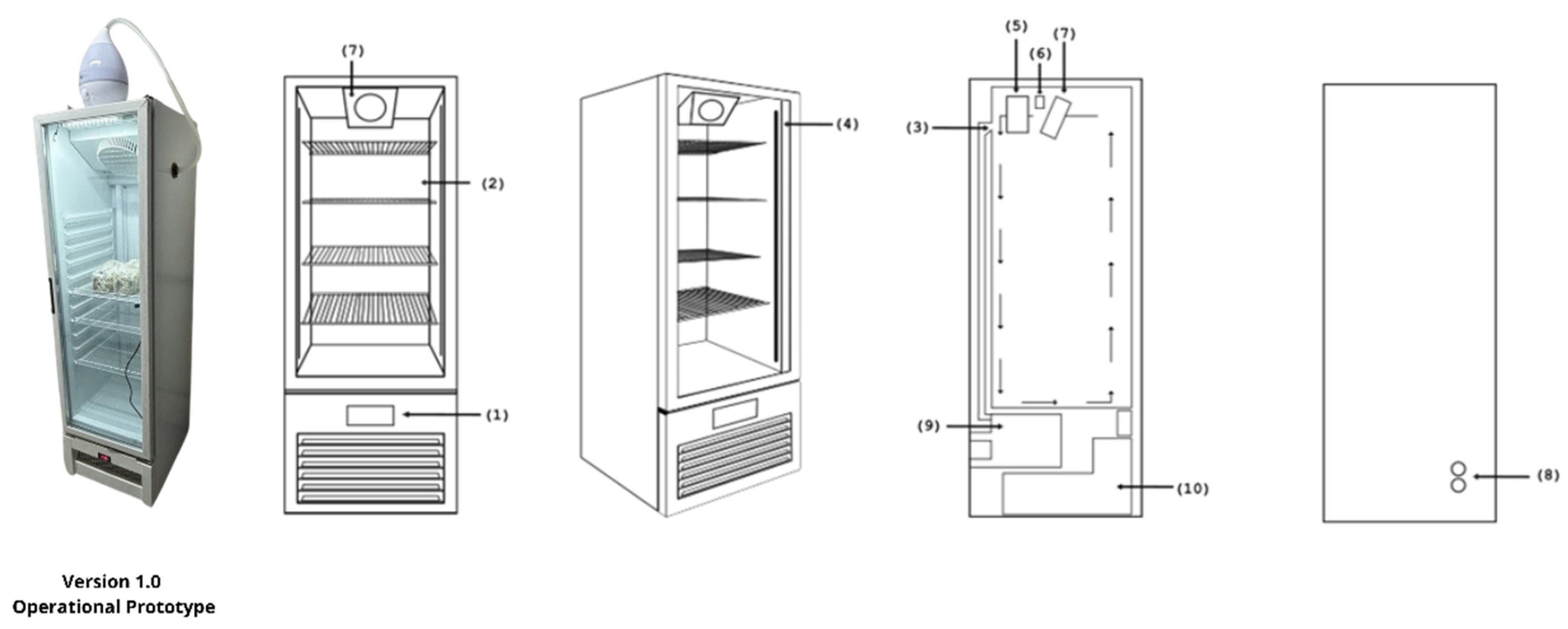 | Glass-door refrigerator | Volume: 326 L; modified with external ports | Maintains chamber temperature and allows visual monitoring |