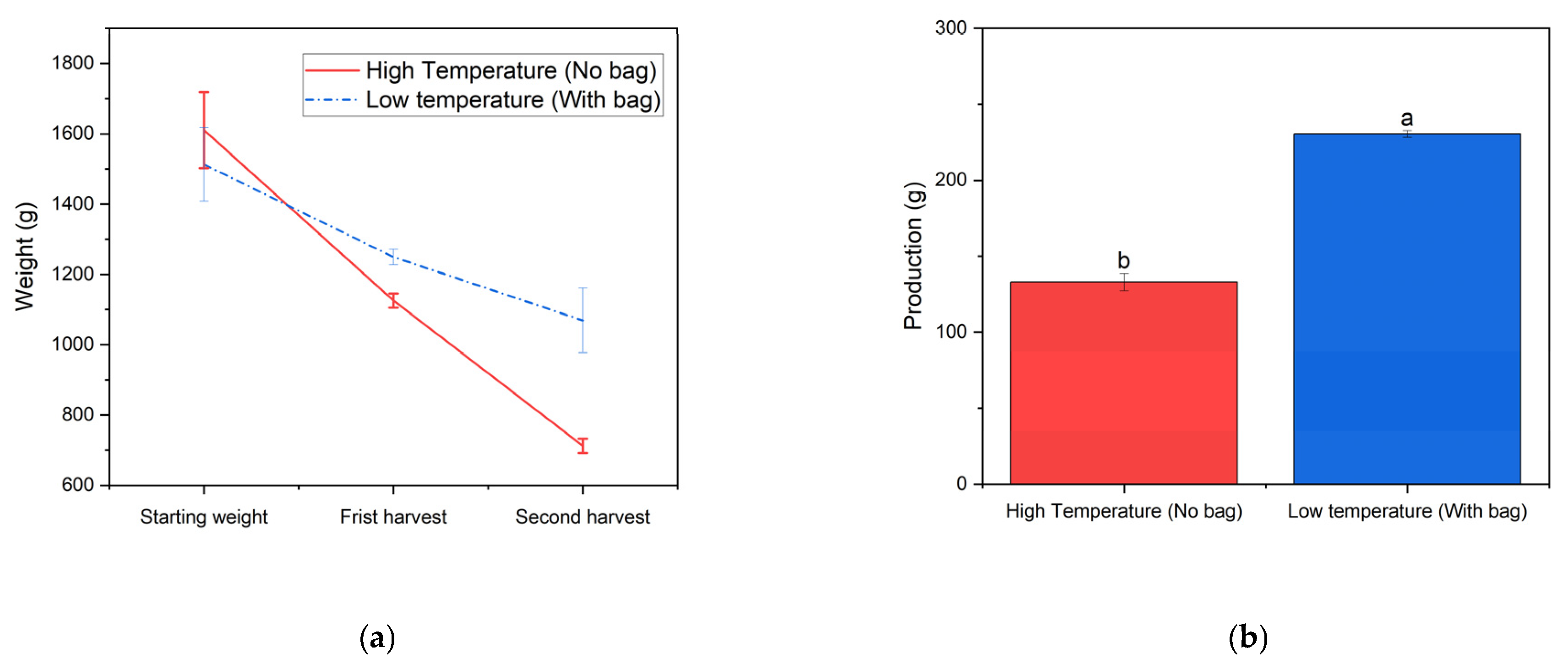 - Hu, Y.; Xue, F.; Chen, Y.; Qi, Y.; Zhu, W.; Wang, F.; Wen, Q.; Shen, J. Effects and mechanism of the mycelial culture temperature on the growth and development of Pleurotus ostreatus (Jacq.) P. Kumm. Horticulturae 2023, 9, 95. [Google Scholar] [CrossRef]