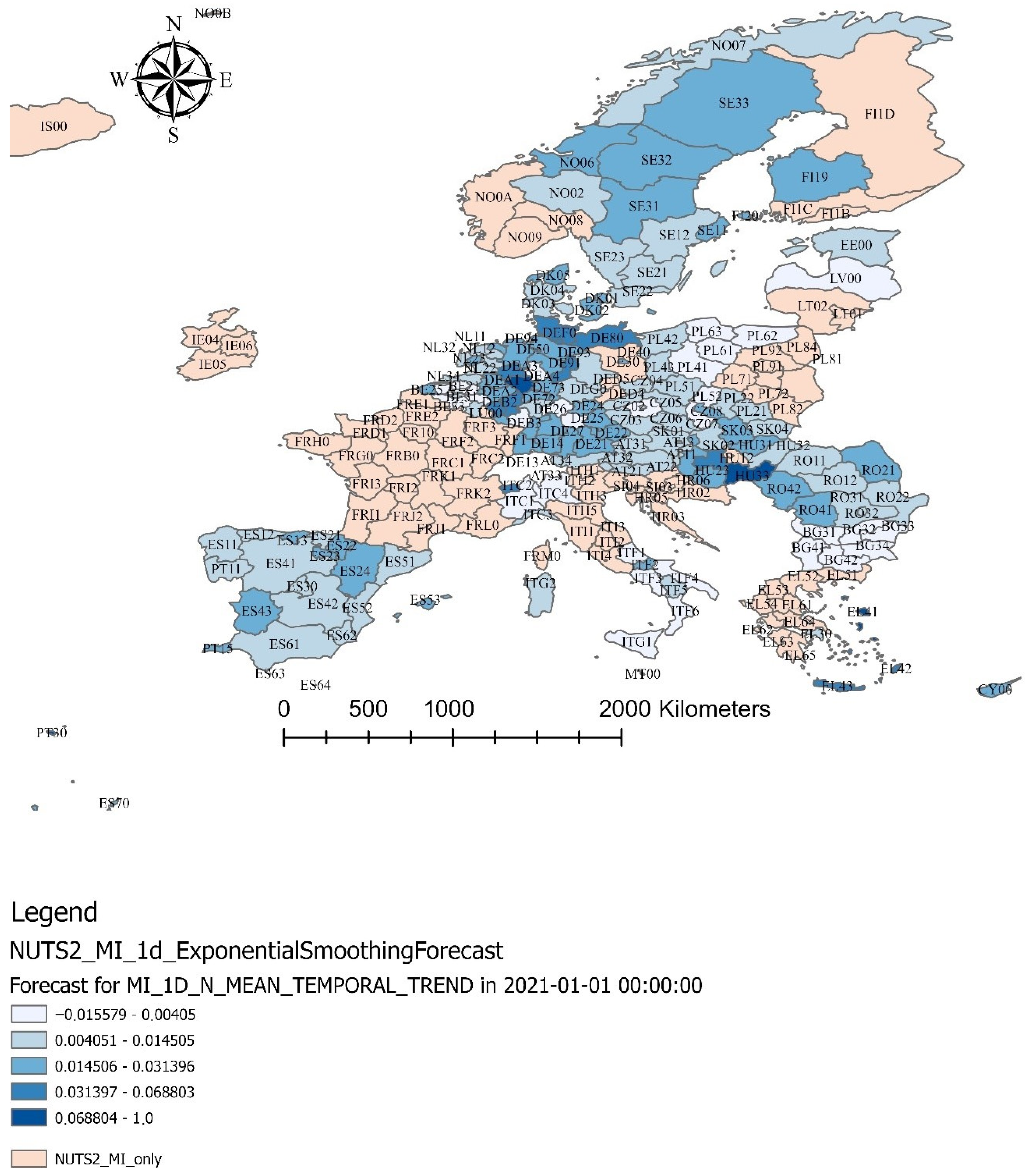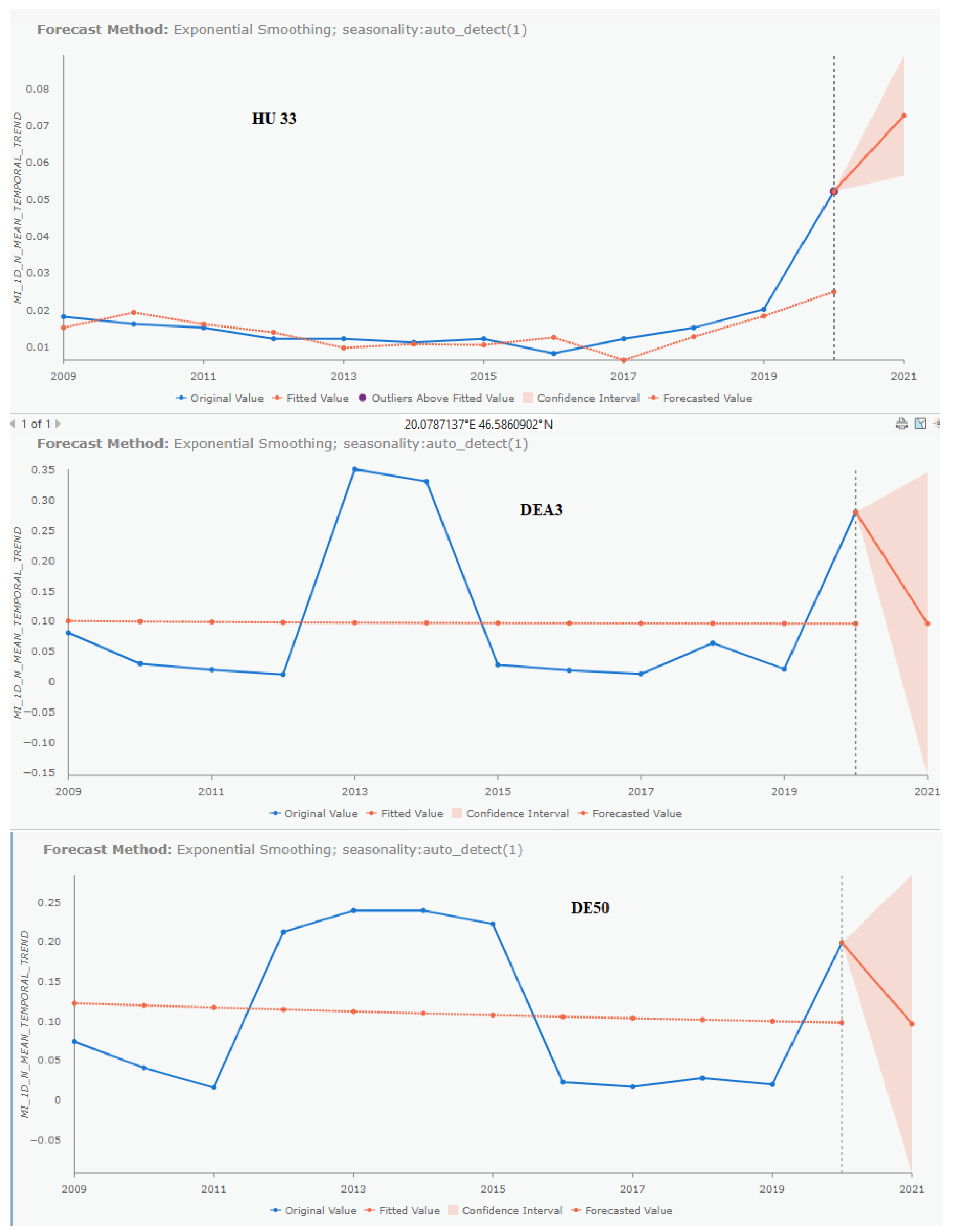 | RQ6. Forecastability of MI trajectories. | H6 (forecastability): MI trajectories are sufficiently persistent to allow short-term forecasting, with uncertainty highest in extreme regions. | Confirmed: Exponential smoothing forecasts yield low RMSE (≈0.02) overall, with slightly higher errors in regions with extreme volatility (e.g., Madeira, Bremen). | ArcGIS Pro Exponential Smoothing Forecast (RMSE validation) |