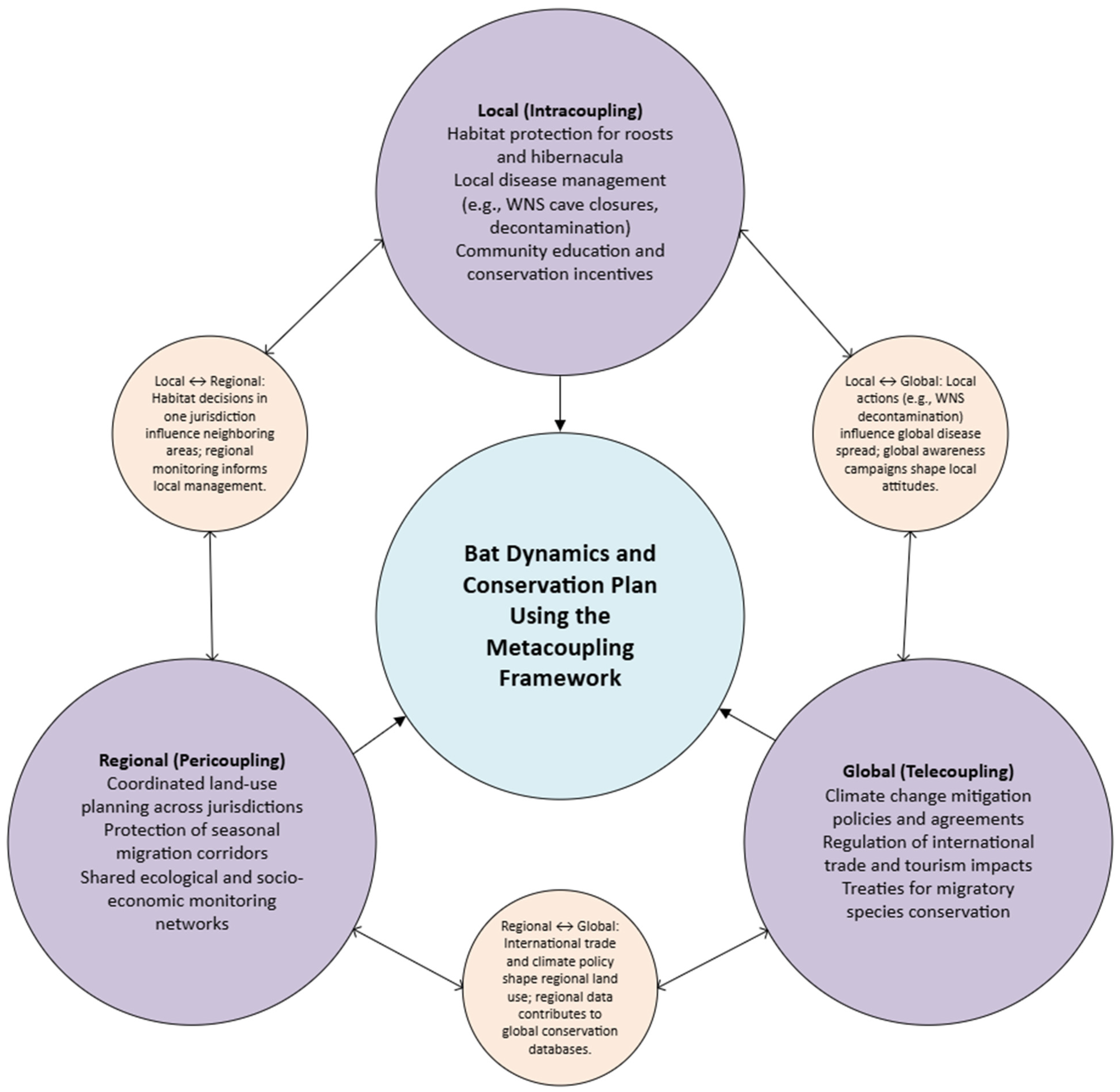 | Pericoupling (adjacent-system interactions) | Interactions between neighboring systems (e.g., counties, states) | Logging displaced across borders; bats migrating across jurisdictions | Coordinate migration corridors, align land-use policies, develop regional timber standards |