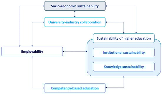 This section reviews the main concepts framing the study: CBE, university–industry collaboration, employability, and the sustainability of HEIs. HEIs serve as the organizational foundation of the system and, through their effective function, contribute to the broader sustainability of the higher education sector, which is expressed through their societal contributions [4]. Figure 1 presents the conceptual framework that guides this research, visually illustrating how these interrelationships must be systematically integrated to reinforce the institutional and knowledge dimensions of sustainability.