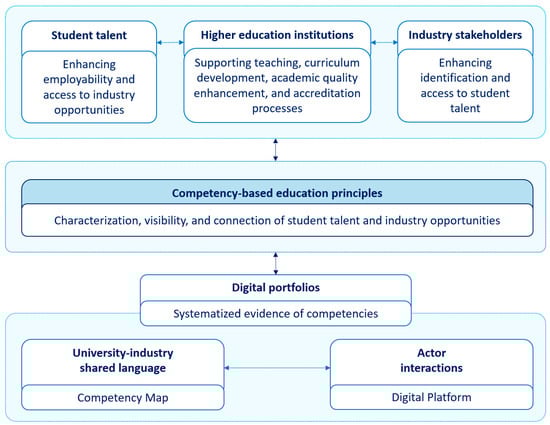 The Integrated Competency-Based Framework for Employability and the Sustainability of Higher Education was conceived as a foundation to align the efforts of universities, student talent, and industry stakeholders. The Framework operationalizes CBE principles and is designed to strengthen the characterization, visibility, and connection of student talent and industry opportunities through digital portfolios, which provide systematized evidence of competencies. It is structured around two key components: a Competency Map, which enables a shared university–industry language, and a Digital Platform, which facilitates actor interactions and digital portfolio-based engagement. Together, these elements aim to enhance employability and access to industry opportunities for student talent, improve the identification and access to student talent for industry stakeholders, and strengthen institutional processes that support teaching, curriculum development, academic quality enhancement, and accreditation. By integrating these components, the Framework reinforces institutional, knowledge, and socio-economic sustainability while promoting alignment between education and labor market needs.