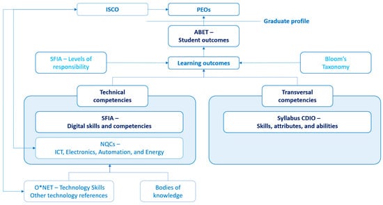 Academic programs design their curricula around PEOs, aligning them with university missions, industry needs, and societal expectations. PEOs link to ABET student outcomes, which are translated into course-level learning outcomes commonly structured through Bloom’s Taxonomy. Although this taxonomy remains a foundational reference in higher education for defining cognitive progression, it primarily reflects academic learning outcomes. The Competency Map extends this perspective by aligning learning outcomes with labor market expectations and occupational roles, ensuring that the development of competencies reflects both academic and professional relevance. These outcomes integrate technical and transversal competencies. To ensure international comparability and labor market relevance, the Competency Map also incorporates occupational classifications from ISCO. Together, these elements define a graduate profile that articulates the competencies expected at program completion.