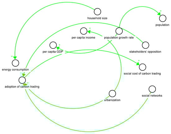 SD modelling is an appropriate modelling technique for dynamic environments with multi-dimensional size that have variables which are time-dependent such as energy and power systems [41]. Carbon trading is a multi-faceted area and cuts across the research areas of economic, ecosystems, transportation, and energy management. This study’s theoretical framework adopted Causal Loop Diagrams to illustrate the positive and negative influences among the variables. Causal loop diagrams in the model were used in describing the conceptual model structure obtained from the researchers’/modelers’ understanding of the system. According to Park, Nepal and Dulaimi [42] and Xia, Chen, Walliah, Buys, Skitmore and Susilawati [43], causal loop diagram (CLD) is used to illustrate the dynamic nature of variables in a study. For this study, diagrams were sketched to indicate the architecture and boundary of the model causal loop. Model causal loop diagrams provide an understanding of how variables relate with one another in the system.