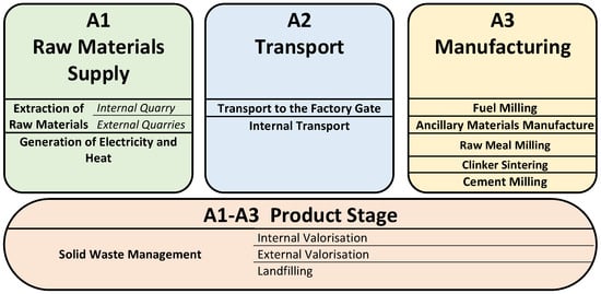 Module A3 describes the flows related with manufacturing of the intermediary product (clinker) and the main product (cement). Lastly, the flows concerning the management of solid waste produced within the factory premises across modules A1–A3 are also defined [,].