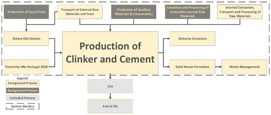 The functional and declared units are used to provide a clearly defined and measurable reference for the material inputs and outputs during its life cycle, and if a product function cannot be unequivocally described, a ‘declared unit’ is utilised [,]. It enables the comparison with equivalent products, and it must be related to typical measuring units used to assess its consumption. As an intermediary product in the construction sector, cement can be used in various applications and, as such, a mass-based declared unit of one metric tonne of Ordinary Portland cement was selected.