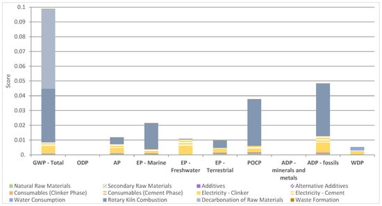 In addition, while there is literature investigating the effect of using different rotary kiln fuel mixes, reducing the clinker content or maximising the use of alternative raw materials [,,,,], the effect of changing unratified model parameters has not yet been evaluated. Variables such as the electricity generation mix are overlooked by the other studies and could potentially have a significant impact on the results. Another often-ignored aspect is the choice of a suitable Life Cycle Impact Assessment (LCIA) method. This step is crucial in any LCA research, as it can have a major impact on the results obtained and therefore on the interpretation by the reader []. The EN 15804:2012+A2:2019 [] standard, which offers guidance for the development of Environmental Product Declarations (EPD) for construction products, has been amended in its A2 revision to require the use of a different LCIA method. Due to its recency, a low number of references were found that assessed the implications of this revised standard compared to previous releases.