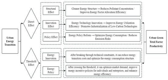 Based on the literature review and research hypotheses mentioned in the above literature, this study constructs a comprehensive theoretical analysis framework. This framework clearly outlines the core path of energy transition affecting urban green total factor productivity and the research logic of this paper. The mechanism transmission path is shown in Figure 1: