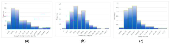Frequency distributions of the core explanatory variables: (a) Energy Technology Innovation Quantity; (b) Energy Policy Quantity; (c) Energy Structure.